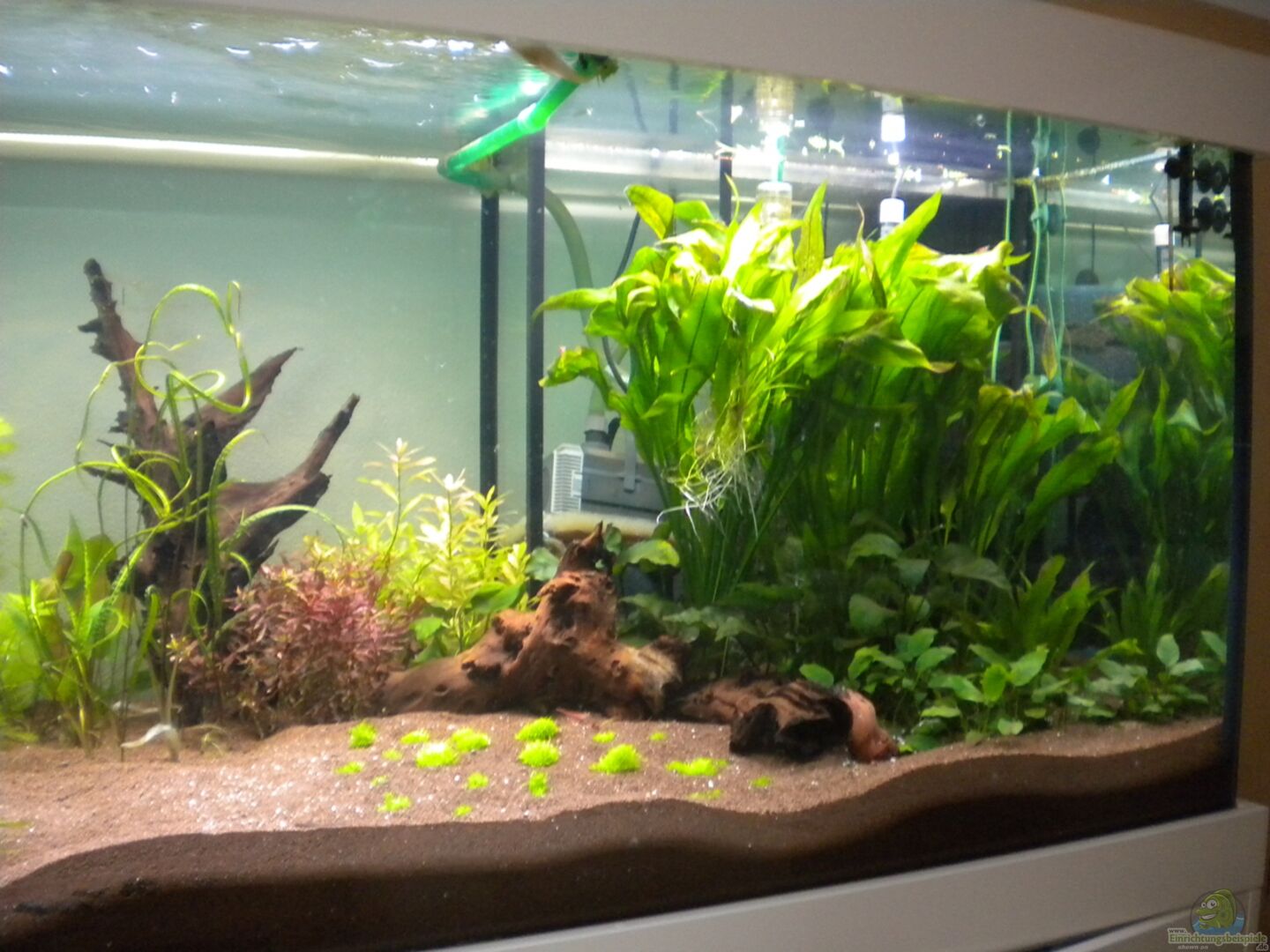 Echinodorus Bleherie (rechts vorm Filter) Echinodorus Regine Hildebrandt (mittig neben der Wurzel) Anubias nana und baterie (rechts hinter der Wurzel und vor den Bleherie´s) Nymphaea Lotus (rot) (rechts, vor Wurzel) Echinodorus Tenellus (mittig) Hygrophila Polysperma (nicht ganz rechts hinten/vor der Pumpe) Hygrophila difformis (am hinteren linken Beckenrand) *Pogostemon helferi Bekam leider zu weinig Licht ab und wurde entfernt *LImnophilla aquatica wuchs gut, verkrautete [...]