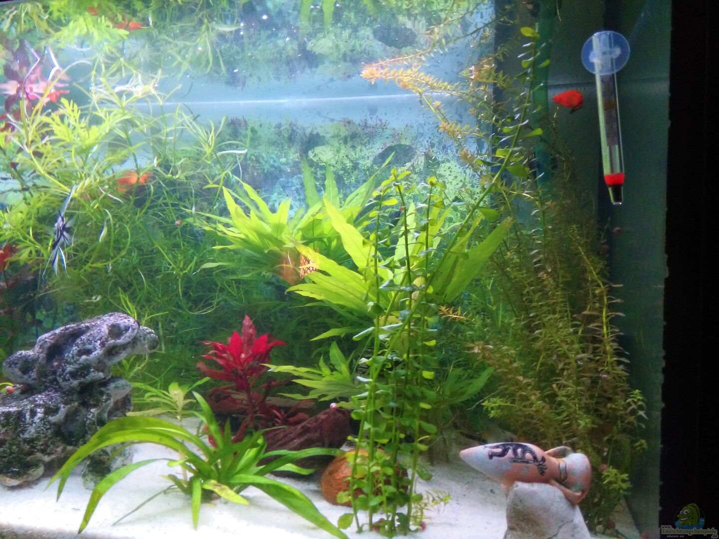 Ganz normales Becken gebraucht gekauft und mit Silikon verklebt und hat oben so eine mittel steg aus glas eingeklebt und rings herrum auch so glasstege um abdeckscheiben drauf legen zu können ....habe ich aber nicht gemacht sondern nur so die beleuchtungsabdeckhabe drüber gestülpt Das Becken steht auf einem Unterschrank aus Holz mit 2 Türen und einem offenen Mittelfach habe ich selber weiss lackiert bzw mit Folie beklebt und die Technik alles im Schrank und dann durch die löcher nach hinten [...]