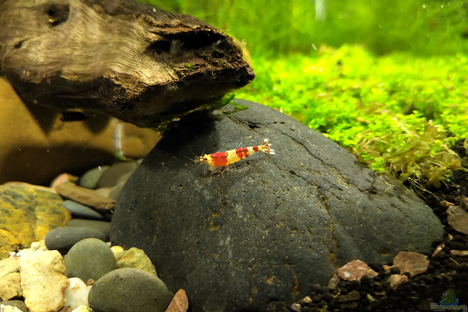 eine Batmanschnecke (Fledermausschnecke) - Neritina auriculata eine Anthrazit-Napfschnecke / Stahlhelmschnecke - Neritina pulligera 5 Red Sakura Garnelen - Neocaridina davidi "Red Sakura" 5 Schoko Sakuras 5 Bienengarnelen 5 Red Bees - die Napfschnecke ist seit Tagen nicht zu sehen (& das in einem 60l Becken!) 5 Zwergpanzerwelse (Corydoras pygmaeus) 6 Perlhuhnbärblinge (Danio margaritatus)