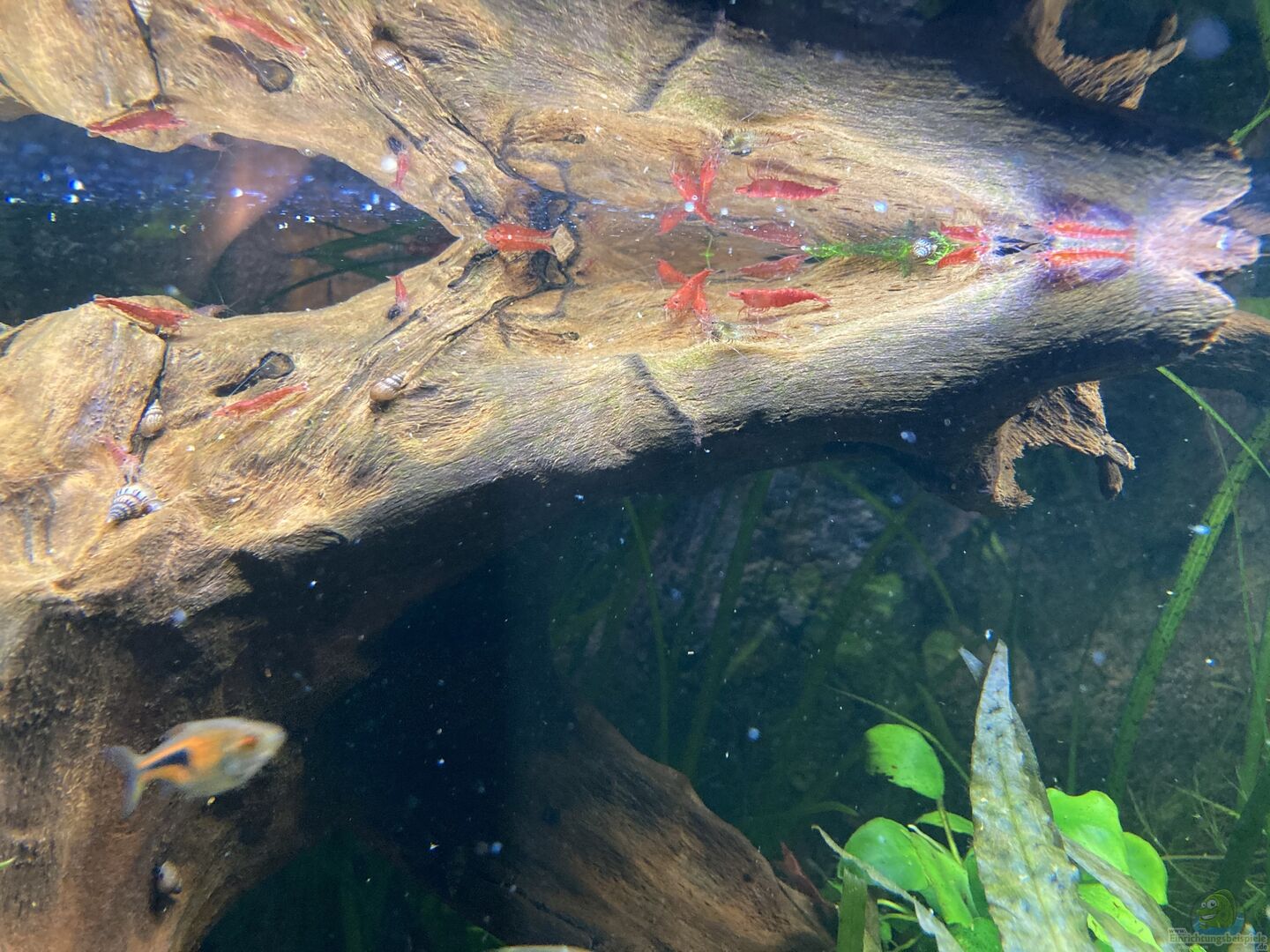 3 marmorierte Fadenfische (Trichogaster trichopterus). 2x Blau und 1x Gold. Das goldene Weibchen ist leider verstorben. 12 Blutsalmler (Hyphessobrycon eques) 20 Espes Keilfleckbärblinge (Trigonostigma espei) 13 Orangeflossenpanzerwels (Corydoras sterbai) 5 Metallpanzerwelse (Corydoras aeneus) - aus altem Aq übernommen 8 Ohrgitterharnischwelse(Otocinclus affinis) 4 Panaqolus cf. maccus "L 104" viele Turmdeckelschnecken etwa 8 Rennschnecken viele Red fire Garnelen (Neocaridina [...]