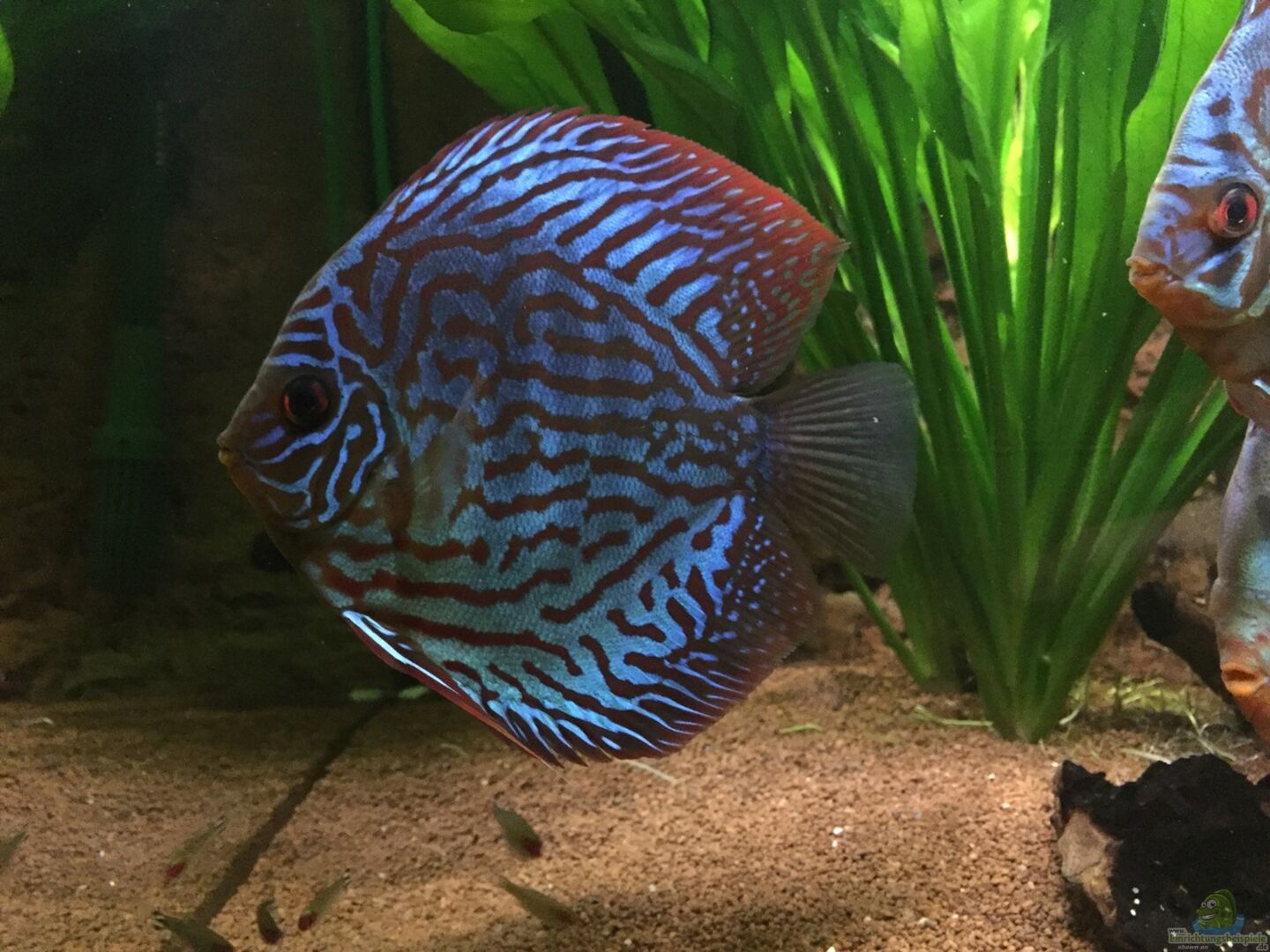 7 Stendker Diskus 20 Neonsalmler (Paracheirodon) 20 Rotkopfsalmler (Hemigrammus bleheri) 5 Panda Saugbarbe (Garra flavatra) 4 Netzpinselalgenfresser (Crossocheilus reticulatus) einige Rennschnecken, Anthrazit-Napfschnecken und Raubturmdeckelschnecken