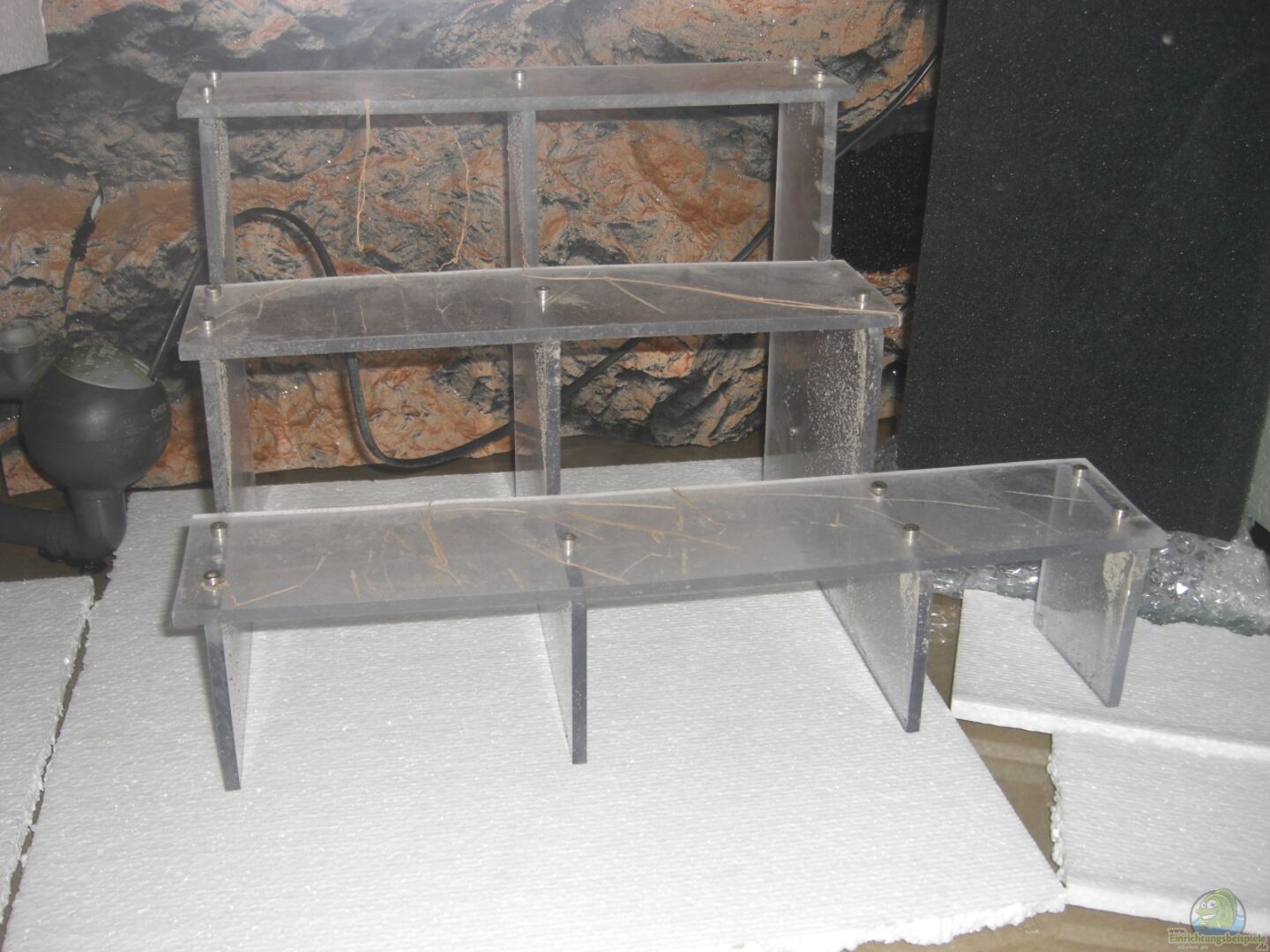 Rückwand: Rock II von Steinzeit-Design Aufgrund der starken Konturen der Rückwand liegt sie nicht Plan an der hinteren Scheibe an, sondern dort befindet sich ein Hohlraum von mehreren Zentimeter - damit das Wasser dahinter zirkulieren kann, wurden in die Rückwand zwei Lüftungsgitter eingelassen in die schwarzer Filterschwamm steckt. Zudem wurden zwei Rohrleitungen installiert an denen je eine Eheim Aquaball 1212 angeschlossen wurde - die Pumpen können genau in den Rohrbogen eingesteckt werden. [...]