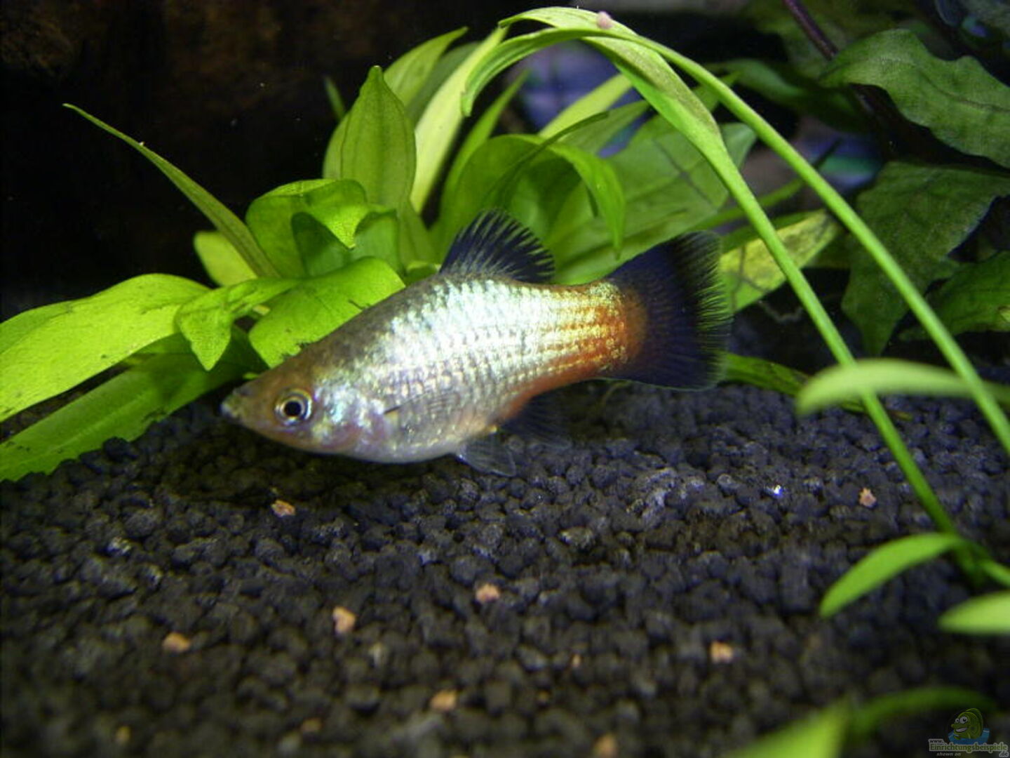 1 Regenbogenplaty 5 rote Platy 1 blauer Antennenwels 2 Posthornschnecken