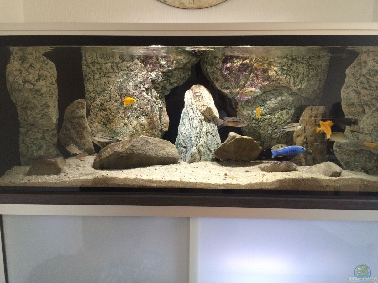 Becken aus 10mm Floatglas von JEKO-Aquaristik. Das Becken ist dreiseitig mit opaker Folie in schwarz matt beklebt. Rechte Seitenscheibe teilweise Kontur ausgeschnitten. Abgedeckt mit 4 Stück 4mm Scheiben. Jeweils rechts & links vom Mittelsteg 2 Stück die in schwarzen E-Profilen geführt werden. Diese liegen auf den längs verklebten Stegen. Somit kann ich die Abdeckscheiben relativ einfach bewegen - quasi Schiebetüren als Abdeckung. Unterbau besteht aus 45mm Alu-Profilen von Aluprofiltechnik [...]