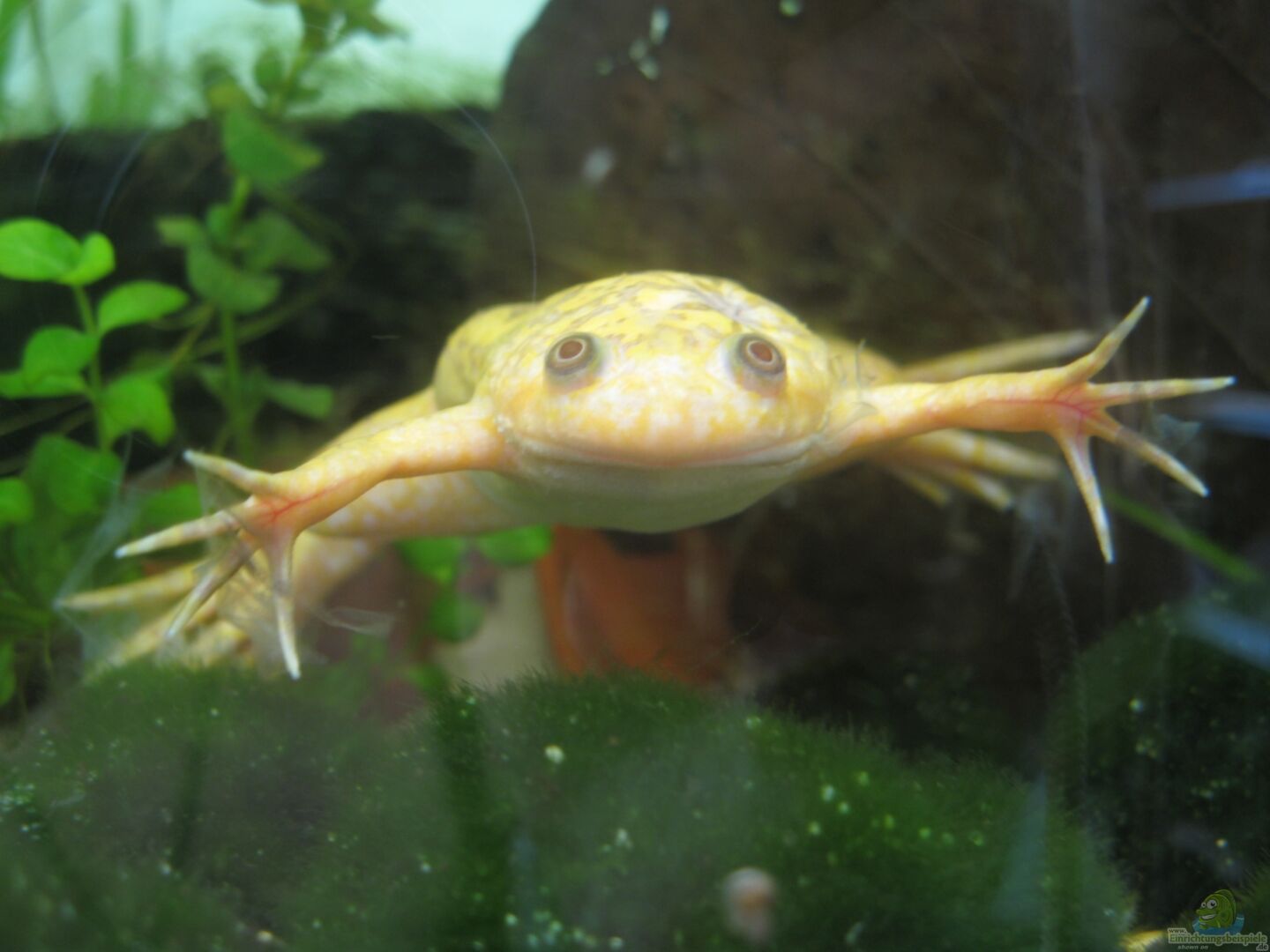 Xenopus laevis, 4 Weibchen 1 weiblicher Naturfarbender (Gitti), geboren wahrscheinlich im Sommer 2012, eingezogen am 20.04.2013, in tierärztlicher Behandlung wegen im Bein eingelagerter Lymphflüssigkeit im August 2014 (tägliche Bäder in isotonischer Kochsalzlösung) - seit Anfang 2015 symptomfrei 1 weiblicher Naturfarbender (Happy), geboren 2013, eingezogen 28.12.2014 1 weiblicher Naturfarbender (Louanne), geboren 2013, eingezogen am 28.12.2014 1 weiblicher Albino (Gemma), geboren [...]