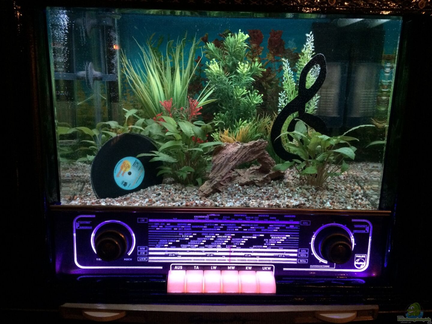 . Video von meinem Becken auf Youtube . Inspiriert hat mich für dieses Projekt eine TV-Sendung auf dem "Männerkanal", denn hierbei wurde ein Meerwasser-Aquarium in einer alten Jukebox verbaut. Aus Platzgründen musste ich mir allerdings eine Alternative überlegen. Ein AQ in einem Röhrenfernseher hatte es auch schon mehrmals gegeben, aber ein Becken in einem alten Radio zu verbauen, erschien mir daher origineller. Die Herausforderung bestand allerdings darin, die geeigneten [...]