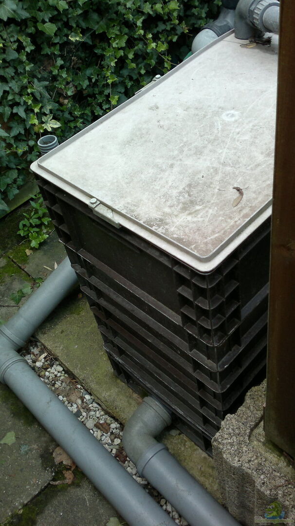Y-Verteiler (regelbar) zur Einstellung der Filterspeisung 2/3 GFK-Filter und 1/3 Rieselfilter Mambramluftpumpe (regelbar) max. 500l/h (Betrieb ganzjährig! Wird im Winter auf der ersten Tiefenstufe plaziert und hält so ca. 60cm Eisfrei)