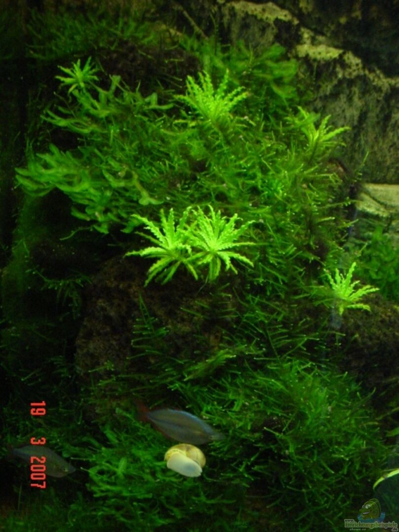 3D-Rückwand aus Kunstharz Lavasteine als Riffaufbau Leuchtquarz Versteinertes Holz Mangrovenholz (bepflanzt mit Microsorum pteropus "Windelov") Mookienholzwurzel (bepflanzt mit Taxiphyllum alternans) Bambusröhrchen (bepflanzt mit Monosolenium tenerum) Schwimmring um die Schwimmpflanzen an einer bestimmten Positionen halten zu können Seemandelbaumblätter