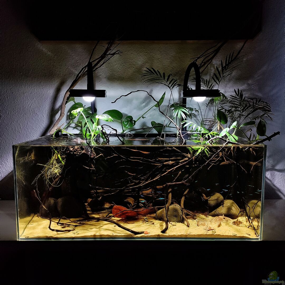 Drachenwurzeln, Zweige, Catappa-Rinde, Talawa-Wurzeln und runde Bachsteine lassen es sehr natürlich aussehen. Durch den beigen Sand und die Laubschicht wirkt es sehr natürlich im Wasser. Spannend wird es im Emersteil: Dort wachsen viele Pflanzen in das Becken hinein, darunter Monstera adanonsii, Epipremnum aureum, Chamaedorea elegans und Philodendron scandens. Viele Wurzeln ragen auch aus dem Wasser in das Becken. Es sieht also aus wie ein versunkener Wald. Die Rückseite des [...]
