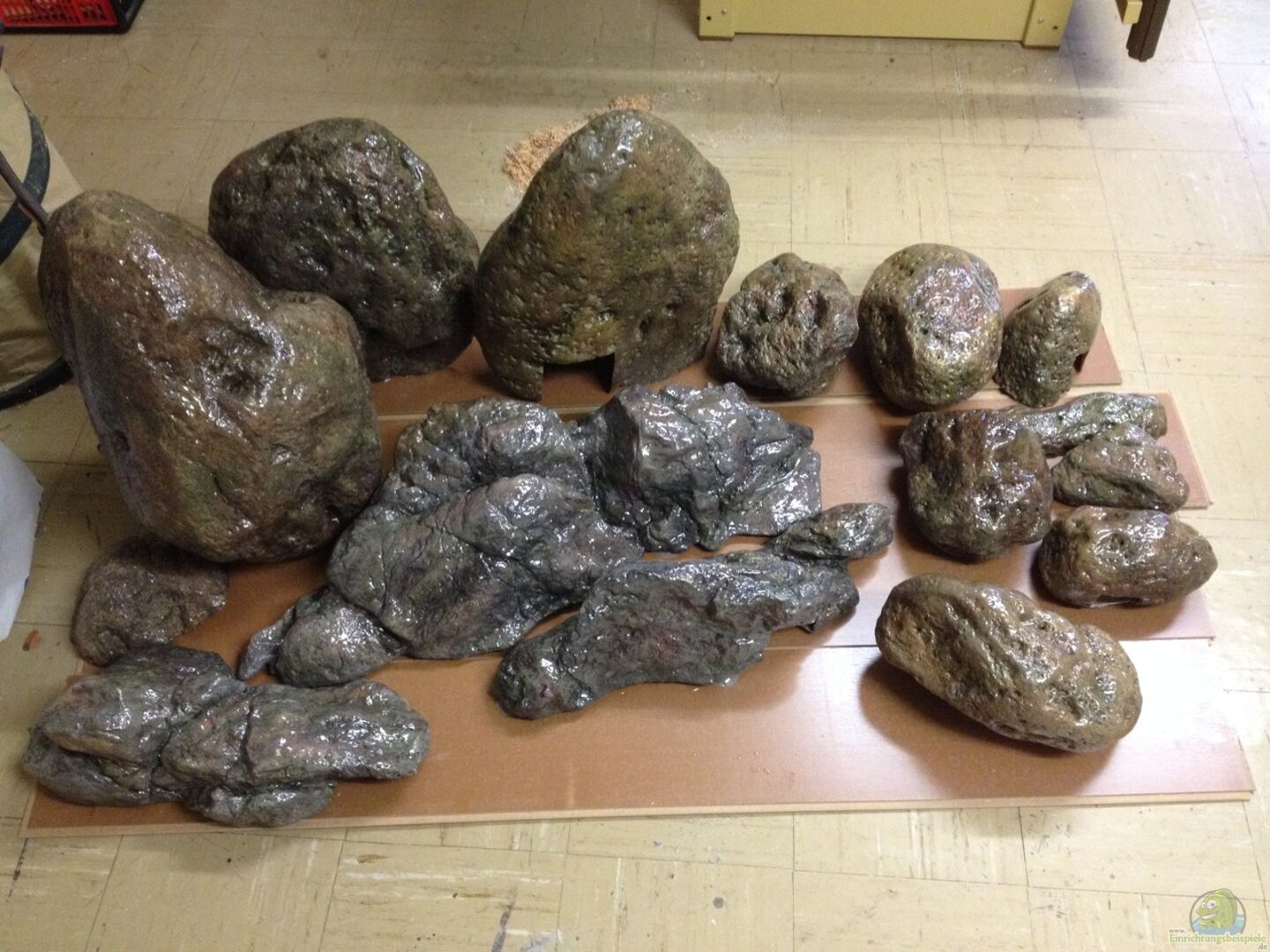 dargestellt werden soll ein naturnaher Ausschnitt der Felszone des Malawisees. Das Aquarium wurde komplett mit Modulen der Firma RockZolid gestaltet. Dabei wurden verwendet: Stone Module: A, H und E Riverstones: R, F, 2x G, I, 2x J, K Die Module und die Riverstones wurden mit Löchern versehen und sind komplett beschwimmbar. Um die Module farblich anzupassen wurden sie zunächst mit Epoxidharz gestrichen und während dem Trocknungsvorgang mit dem im Becken eingebrachten Sand bestreut. [...]