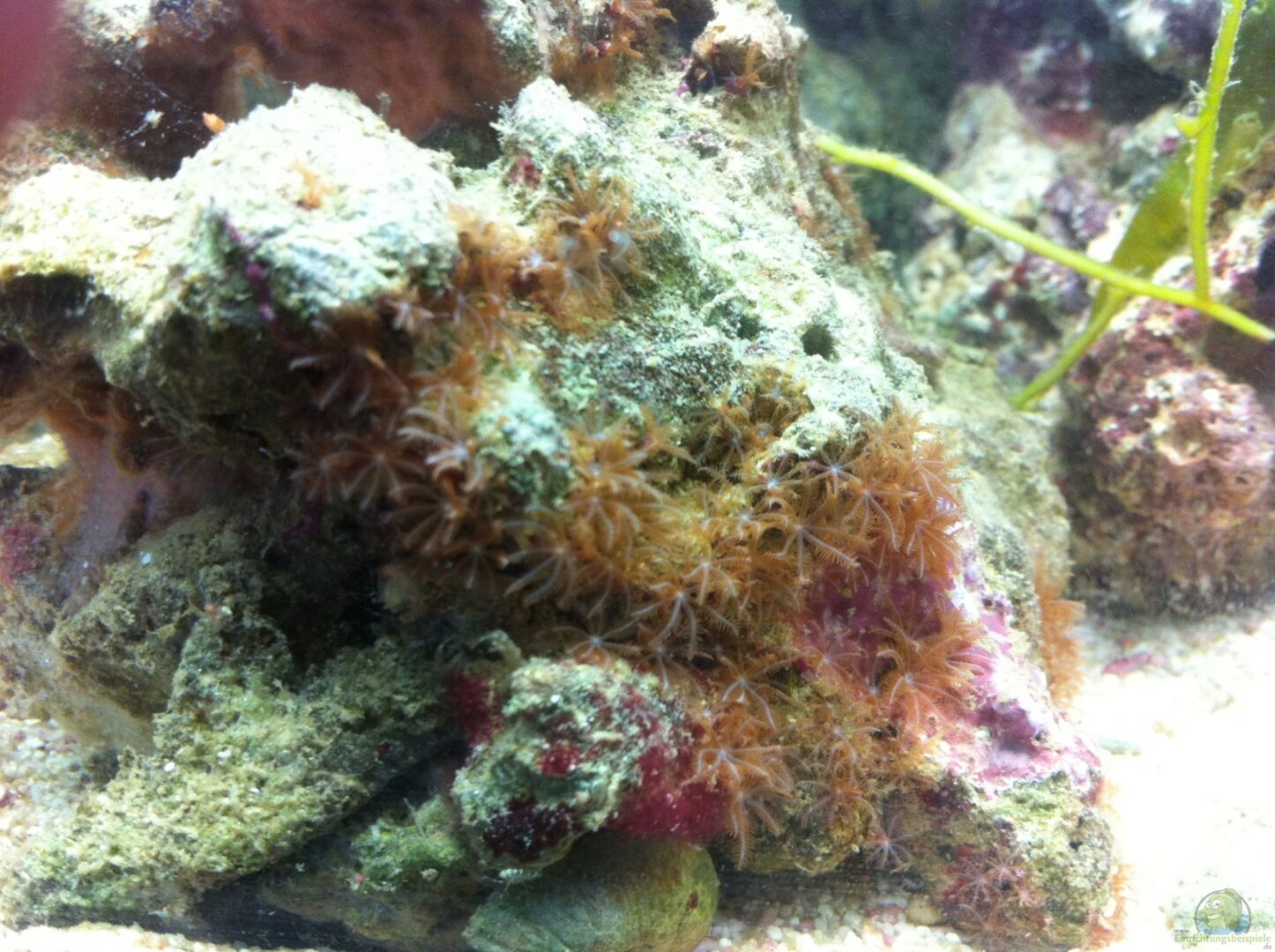 Acropora azurea Röhrenkorallen, vermutlich Clavularia sp. mehrere kleine Röhrenwürmer zwei kleine braune Clibanarius sp. zwei Mini-Seesterne haben sich eingeschlichen, vermutlich Asterina sp. und irgendjemand, der nachts mein Becken "aufräumt!" -ich glaube, dass es ein Borstenwurm ist. geplant: Xenia umbellata eine oder zwei Turboschnecken