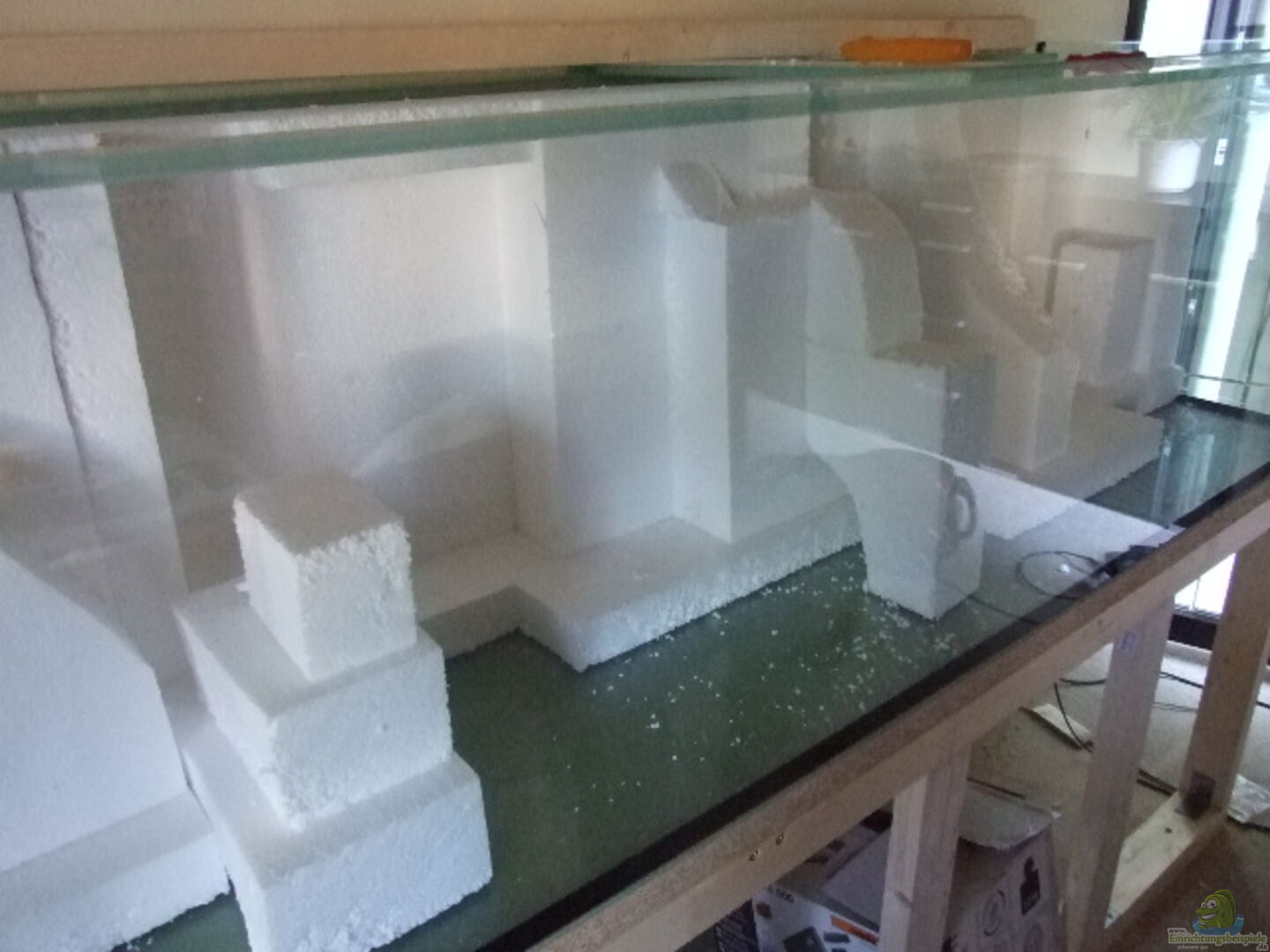 Hintergrund selbstgebaut aus Styropor, zurechtgeschitten, eingeklebt, geformt, Höhlen und Verstecke geschaffen, auch die Steinaufbauten mit Höhlen im Vordergrund aus dem selben Material, farblich gestaltet. Den Rest besorgt die Zeit durch Algenwachstum