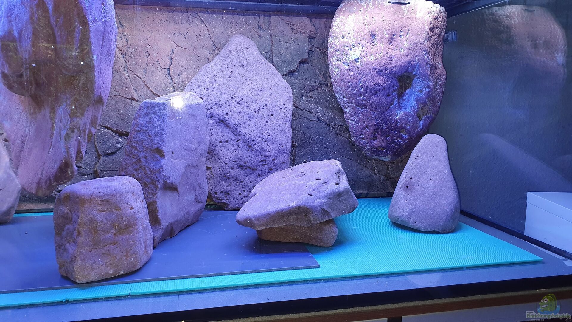 Kantengerundete Flusskiesel aus rotem Buntsandstein in verschiedenen Grö??en, ca 150 kg. Um das Gewicht zu verteilen, ist der Glasboden mit Styroporplatten und 5mm Hartplastikplatten ausgelegt. Einige Felsen stehen stabil senkrecht als Sichtschutz und Reviergrenze. 2 flache Steine links und rechts sind als Laichplatz für die Ophthalmotilapia gedacht. Zahlreiche Schneckenhäuser in verschiedenen Grö??en für Schneckencichliden. Felsmodule von Rockzolid, die mit einem Gemisch aus vermahlenem [...]
