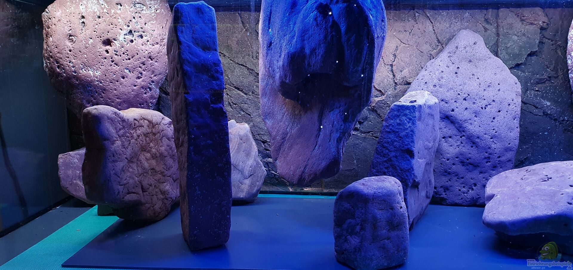 Kantengerundete Flusskiesel aus rotem Buntsandstein in verschiedenen Grö??en, ca 150 kg. Um das Gewicht zu verteilen, ist der Glasboden mit Styroporplatten und 5mm Hartplastikplatten ausgelegt. Einige Felsen stehen stabil senkrecht als Sichtschutz und Reviergrenze. 2 flache Steine links und rechts sind als Laichplatz für die Ophthalmotilapia gedacht. Zahlreiche Schneckenhäuser in verschiedenen Grö??en für Schneckencichliden. Felsmodule von Rockzolid, die mit einem Gemisch aus vermahlenem [...]