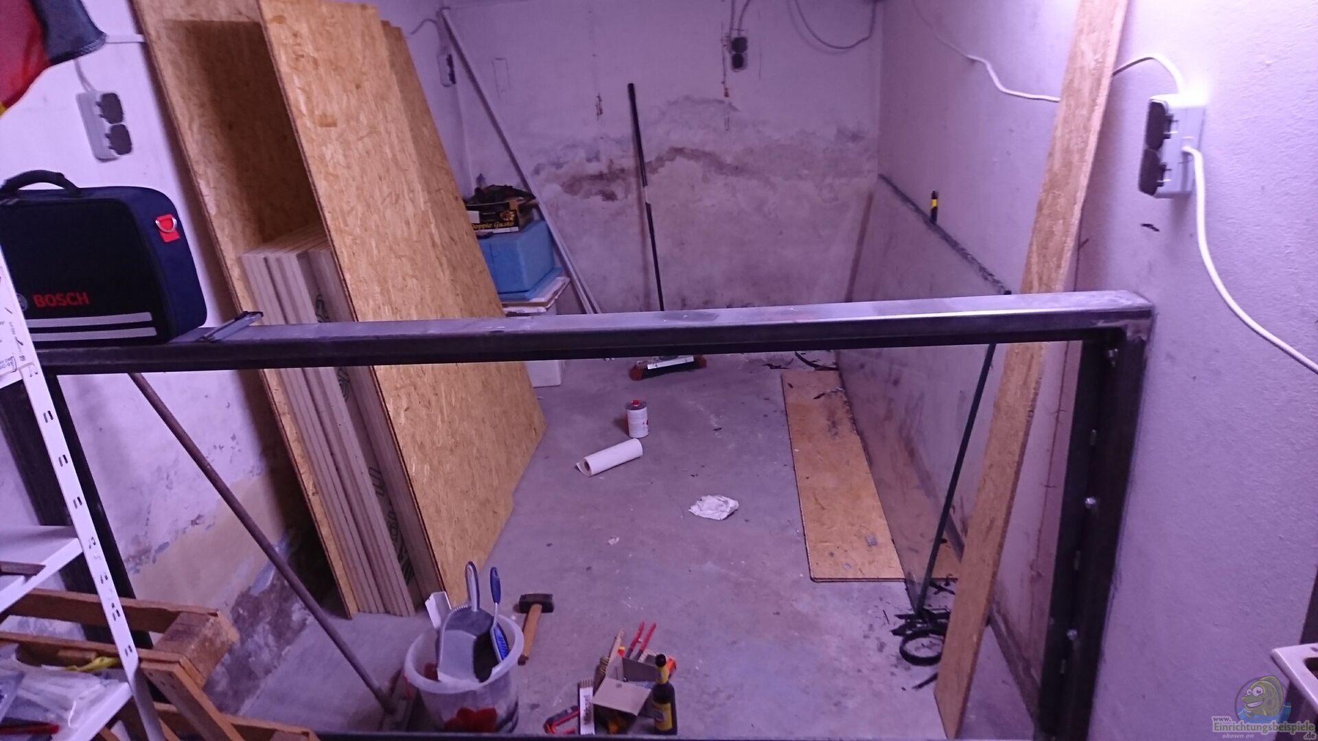 Das Becken besteht aus GFK und einer Frontscheibe. Ein Kellerraum ist durch die Frontscheibe abgetrennt worden und dahinter wurde dann mit Glasfasermatten und Epoxidharz das Becken gebaut. Die Filterung steht oberhalb des Beckens und besteht aus zwei 130cm Filterbecken.