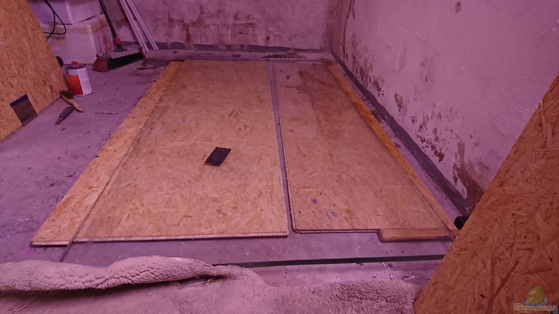Das Becken besteht aus GFK und einer Frontscheibe. Ein Kellerraum ist durch die Frontscheibe abgetrennt worden und dahinter wurde dann mit Glasfasermatten und Epoxidharz das Becken gebaut. Die Filterung steht oberhalb des Beckens und besteht aus zwei 130cm Filterbecken.