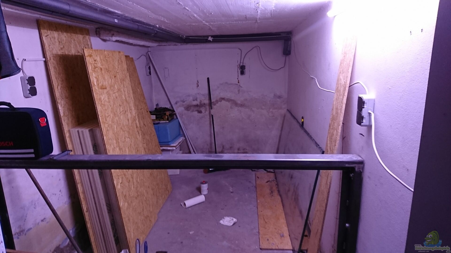 Das Becken besteht aus GFK und einer Frontscheibe. Ein Kellerraum ist durch die Frontscheibe abgetrennt worden und dahinter wurde dann mit Glasfasermatten und Epoxidharz das Becken gebaut. Die Filterung steht oberhalb des Beckens und besteht aus zwei 130cm Filterbecken.