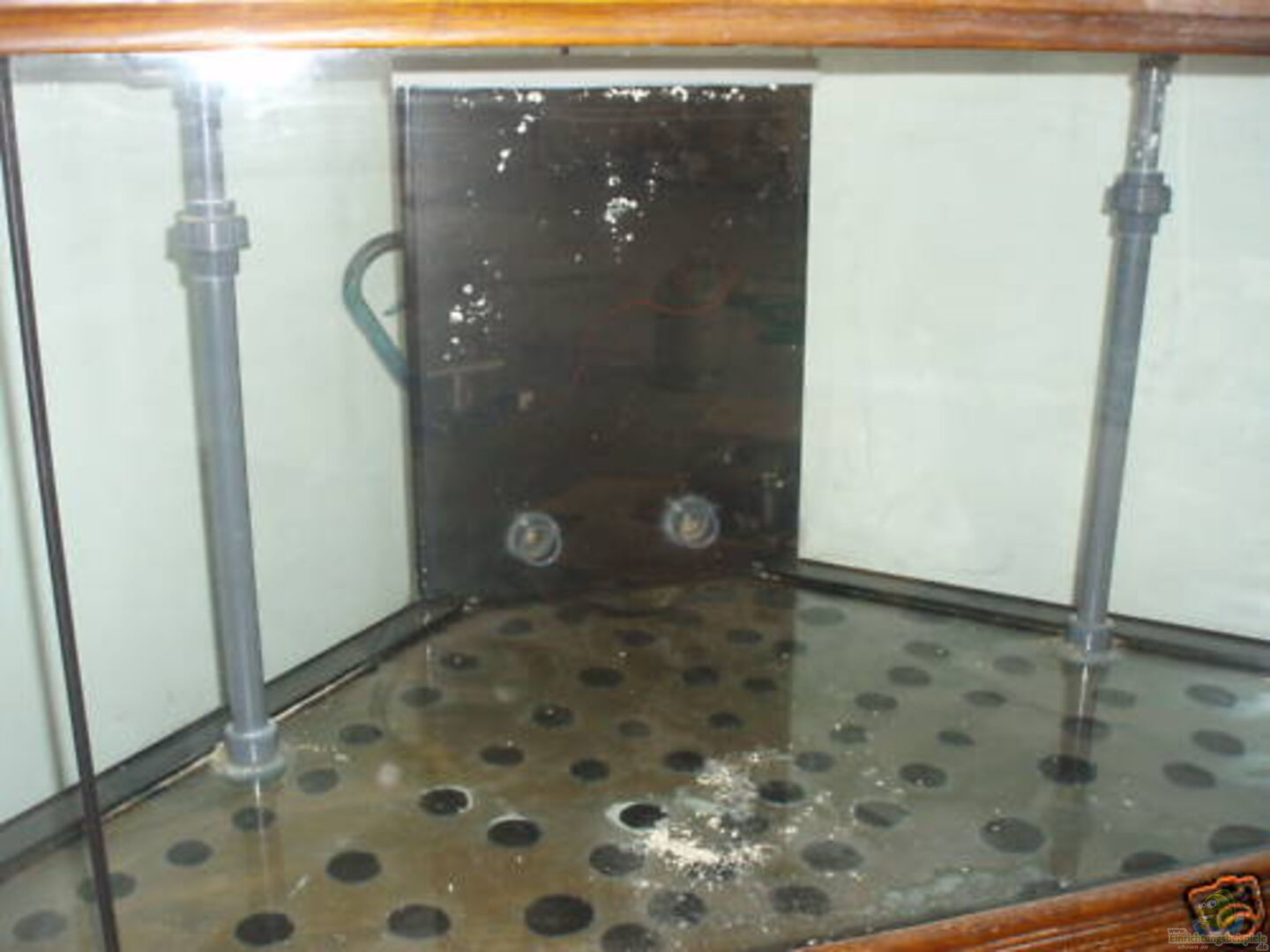 Ehemaliges Meerwasser Aquarium. Schenkel Länge jeweils 110 cm. Seitenscheiben je 36 cm, Frontscheibe 106 cm. Höhe 70 cm. Mit einer 50 cm breiten Scheibe wurde im hinteren Bereich diagonal ein Ablauf- / Filterbereich kreiert. In diesem befinden sich zwei Bohrungen für den Ablauf, die aktuell nicht mehr genutzt werden sollen, denn ich möchte ein lautloses Aquarium haben. Im Aquarium befinden sich zwei Zuläufe als 1 1/4 " Zoll PVC Rohre, die ich ebenso nicht mehr nutze.