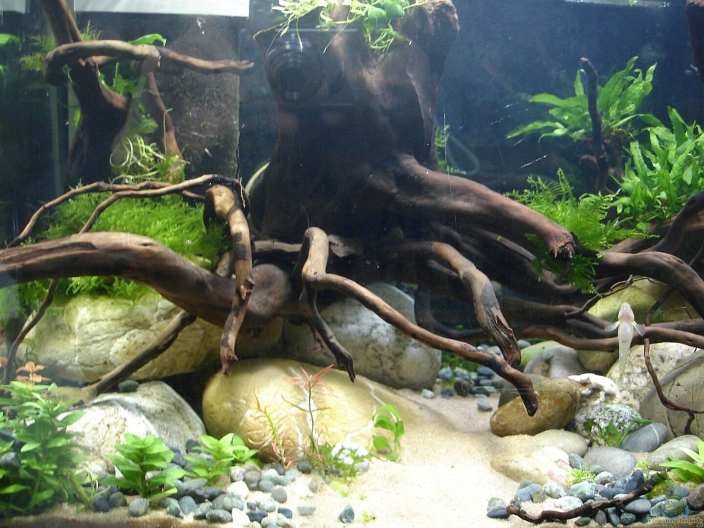 1 chinesische Rotholzwurzel, in 3 Teile geschnitten, da sie sonst nicht reingepasst hätte div. Flusskiesel, selbst gesammelt und Flusskies