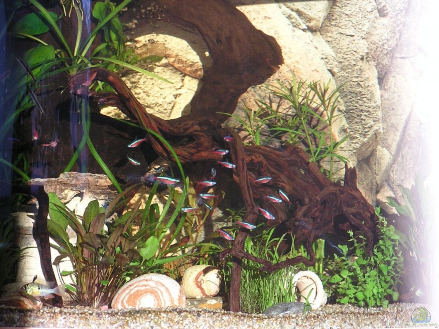 2 x Ancistrus sp. albino (gelber Antennenwels) 2 x Ancistrus dolichopterus (blauer Antennenwels) 4 x Trichogaster chuna (Honiggurami) 22 x Paracheirodon axelrodi (roter Neon) 3 x Pterophyllum scalare (Skalare) 2 x Mikrogeophagus altispinosus (Schmetterlingsbuntbarsch) 3 x Crossocheilus siamensis (siamesische Rüsselbarbe) 4 x Amano Garnele 1x Apfelschnecke