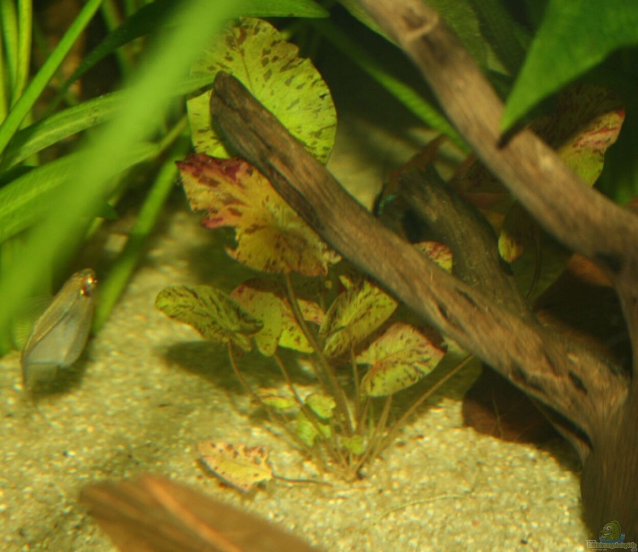 Schwimmpflanzen: ***** Brasilianischer Wassernabel (Hydrocotyle leucocephala) Indischer Wasserstern (Hygrophila difformis) Hintergrund: ***** Leopoldina-Schwertpflanze (Echinodorus major) Seiten: * Vallisneria spiralis Argentinischer Froschlöffel (Echinodorus argentinensis) Breitblättriges Speerblatt (Anubias barteri) Mitte: ***** Roter Tigerlotus (Nymphaea lotus var. rubra) Zwergspeerblatt (Anubias barteri var. nana)