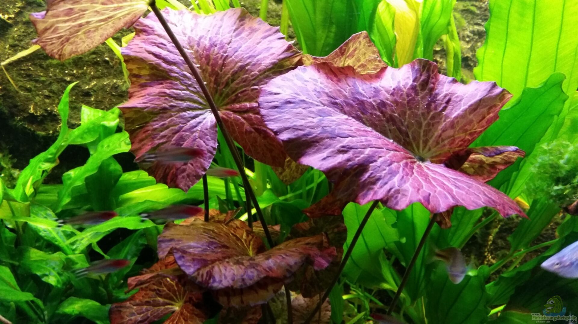 Gro??e Amazonas Schwertpflanze / Echinodorus bleherae ( sehr dominant in der Mitte ) Kleine Amazonas (fast verschwindend neben der Gro??en) Roter Tigerlotus / Nymphaea Lotus ( Blätter reichen bis an die Wasseroberfläche, manchmal erscheint eine wei??e Blüte) Javafarn / Microsorum pteropus (auf Wurzeln auf der Schieferhöhle und an der Rückwand angewachsen) Riesenvallisneria / Vallisneria gigantea (im Hintergrund) Sü??wassertang /Lomariopsis Prothallium (auf der Wurzel angewachsen) Javamoos [...]