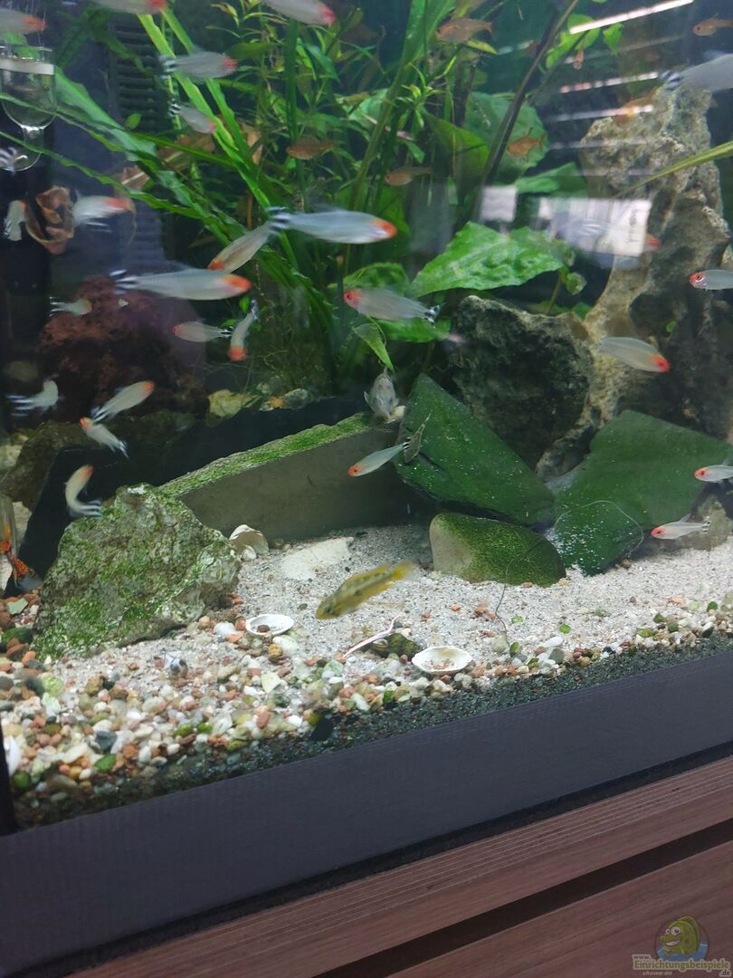 50 Hemigrammus bleheri - Rotkopfsalmler - 20 Hyphessobrycon amandae - Feuersalmler 25 Rasbora espei - Espes Keilfleckbärbling - 5 Zwergpanzerwelse, Corydoras pygmaeus 25 Corydoras (verschiedene Arten) 15 Ohrgitterwelse 8 Prachtalgenfresser - Garra flavatra 4 Rothaubenerdfresser Geophagus steindachnerie 2/2