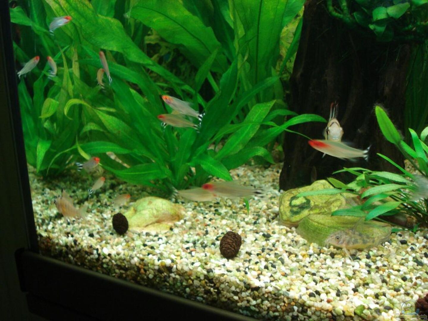 2 Pterophyllum scalare (Skalar) (1m/1w) 2 Mikrogeophagus altispinosus (Boliv. Schmetterlingsbuntbarsch) (1m/1w) 15 Hemigrammus bleheri (Rotkopfsalmler) 5 Hyphessobrycon bentosi (Schmucksalmler) 6 Corydoras paleatus (Marmorierter Panzerwels) 5 Otocinclus (Ohrgitterharnischwels) 2 Farlowella acus (Nadelwels) 1 goldene Apfelschnecke 2 Rennschnecken Restbestand aus altem Becken: 4 Paracheirodon innesi (Neonsalmler)