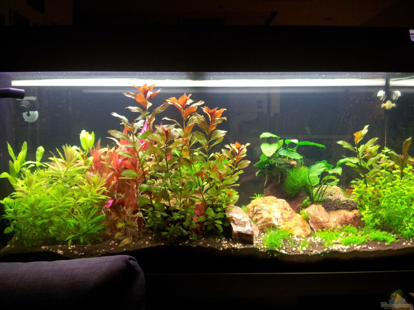 Das Becken fungiert als Raumteiler und ist von 3 Seiten aus Einsehbar. Dennoch liegt der Fokus auf der Frontseite, auf der Rückseite befindet sich eine Eckcouch, sodass die dichte Bepflanzung an der Stelle, wo man meist sitzt, bis direkt an die Scheibe geht. Rechts zur Raummitte hin ist auch auf der Rückseite eine kleine freie Fläche, wo sich vor allem der Schwarm Rotkopfsalmler gerne aufhält. So hat man von beiden Seiten aus einen Blick auf die Fische.