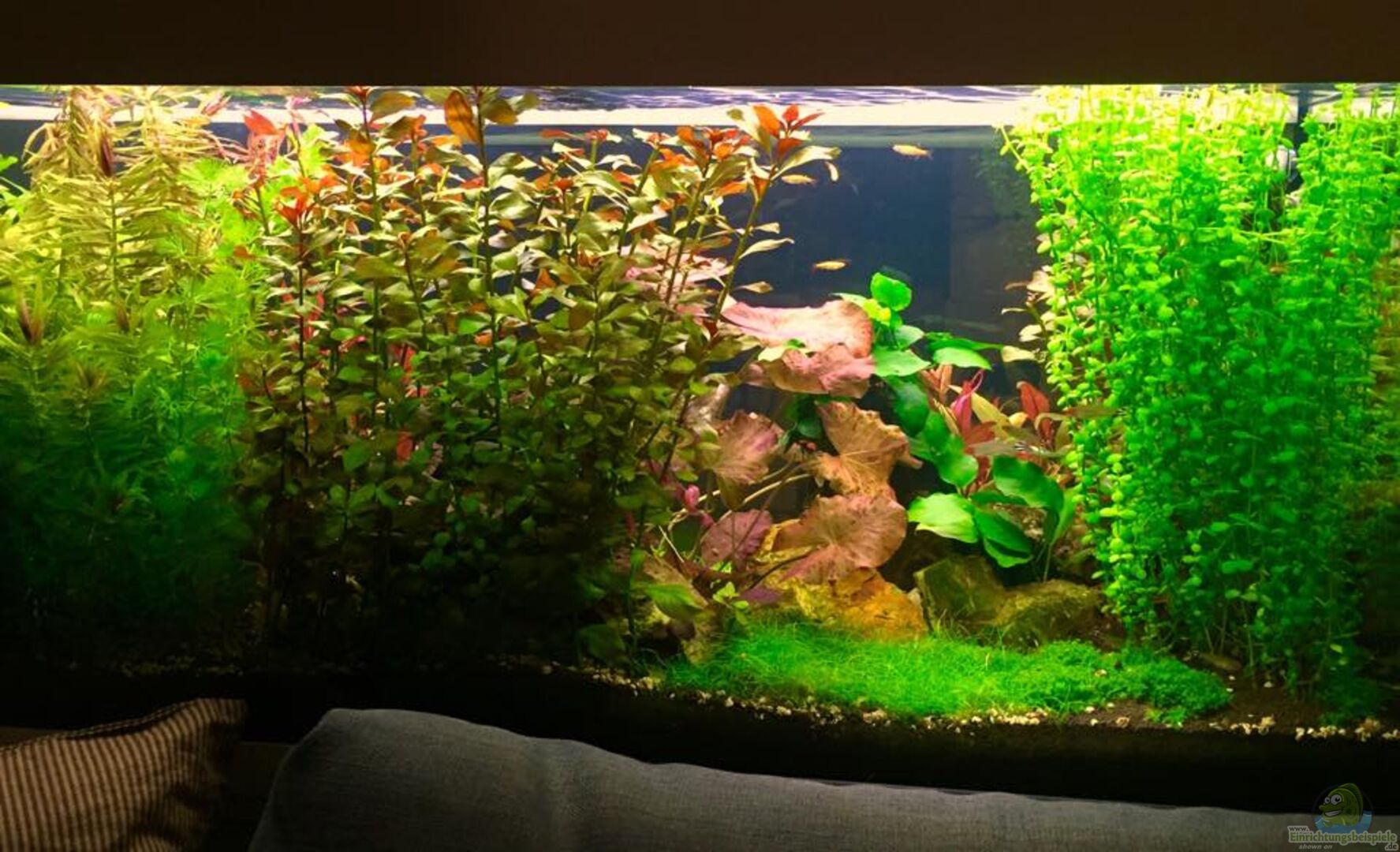 Das Becken fungiert als Raumteiler und ist von 3 Seiten aus Einsehbar. Dennoch liegt der Fokus auf der Frontseite, auf der Rückseite befindet sich eine Eckcouch, sodass die dichte Bepflanzung an der Stelle, wo man meist sitzt, bis direkt an die Scheibe geht. Rechts zur Raummitte hin ist auch auf der Rückseite eine kleine freie Fläche, wo sich vor allem der Schwarm Rotkopfsalmler gerne aufhält. So hat man von beiden Seiten aus einen Blick auf die Fische.