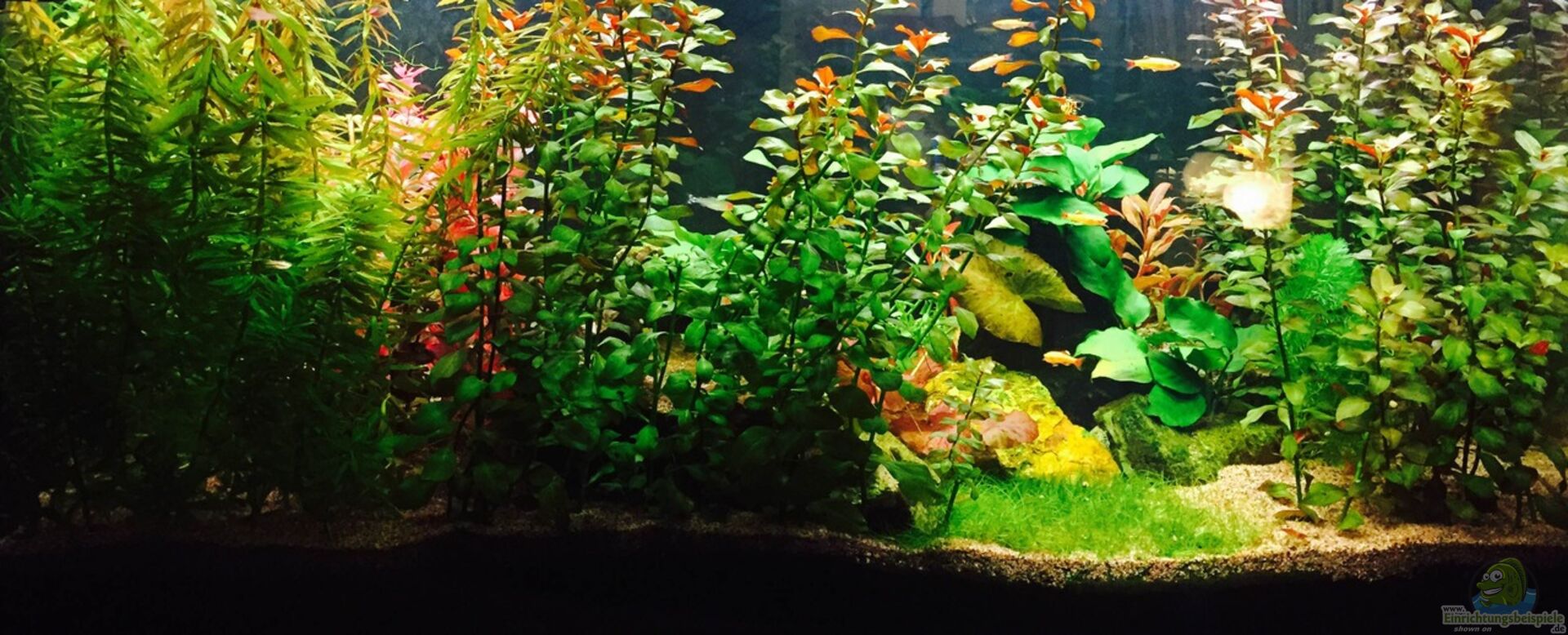 Das Becken fungiert als Raumteiler und ist von 3 Seiten aus Einsehbar. Dennoch liegt der Fokus auf der Frontseite, auf der Rückseite befindet sich eine Eckcouch, sodass die dichte Bepflanzung an der Stelle, wo man meist sitzt, bis direkt an die Scheibe geht. Rechts zur Raummitte hin ist auch auf der Rückseite eine kleine freie Fläche, wo sich vor allem der Schwarm Rotkopfsalmler gerne aufhält. So hat man von beiden Seiten aus einen Blick auf die Fische.