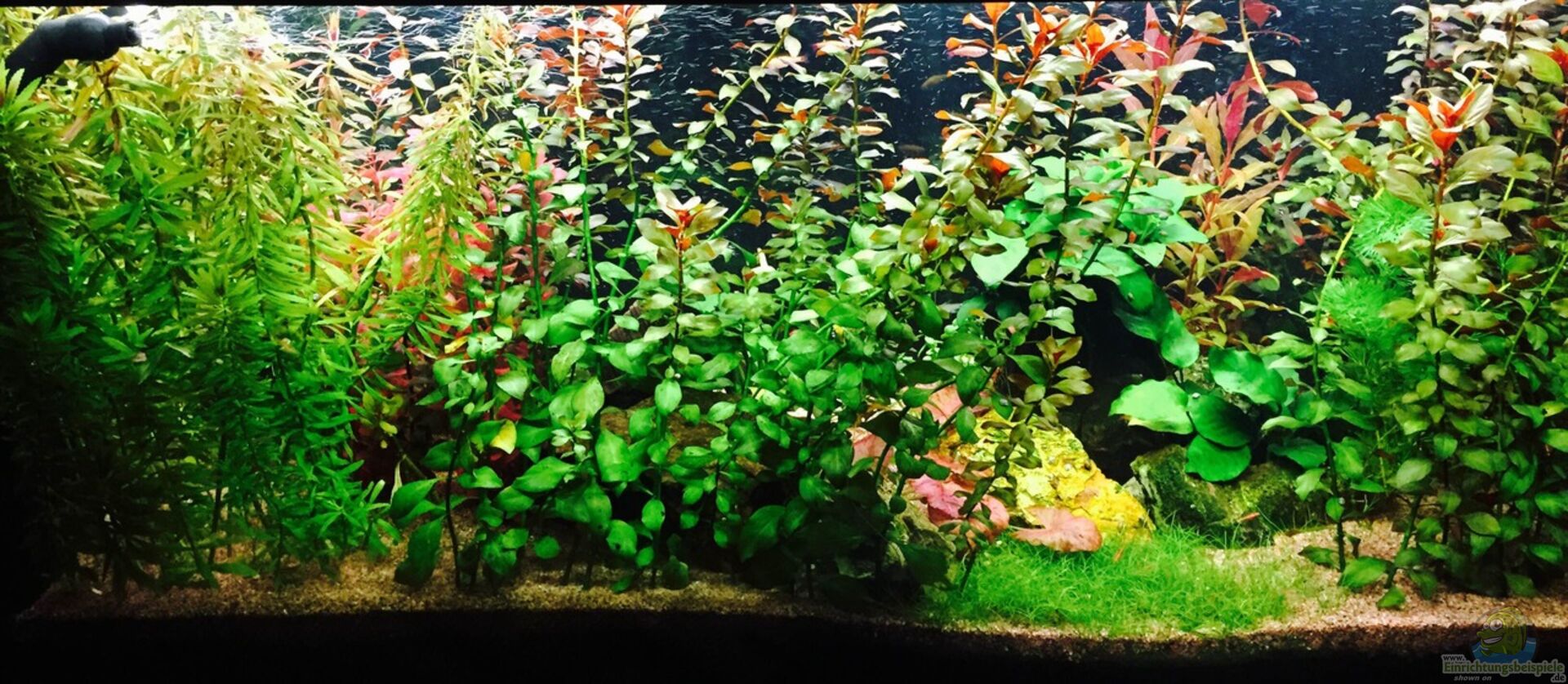 Das Becken fungiert als Raumteiler und ist von 3 Seiten aus Einsehbar. Dennoch liegt der Fokus auf der Frontseite, auf der Rückseite befindet sich eine Eckcouch, sodass die dichte Bepflanzung an der Stelle, wo man meist sitzt, bis direkt an die Scheibe geht. Rechts zur Raummitte hin ist auch auf der Rückseite eine kleine freie Fläche, wo sich vor allem der Schwarm Rotkopfsalmler gerne aufhält. So hat man von beiden Seiten aus einen Blick auf die Fische.