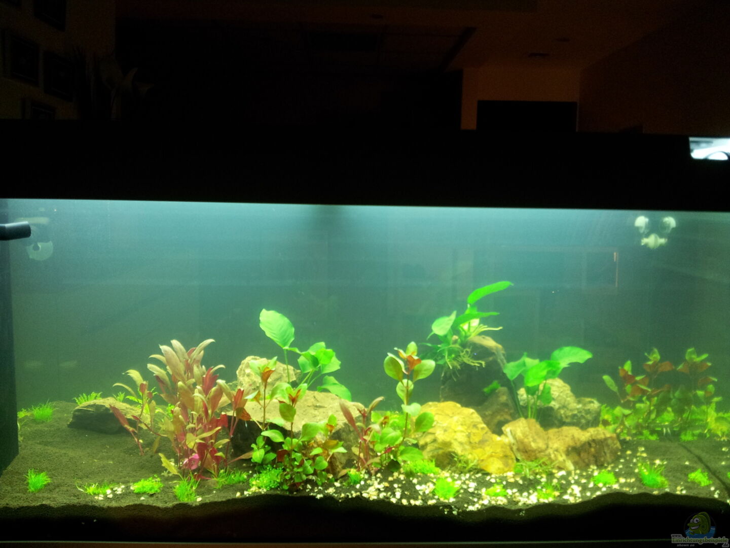 Das Becken fungiert als Raumteiler und ist von 3 Seiten aus Einsehbar. Dennoch liegt der Fokus auf der Frontseite, auf der Rückseite befindet sich eine Eckcouch, sodass die dichte Bepflanzung an der Stelle, wo man meist sitzt, bis direkt an die Scheibe geht. Rechts zur Raummitte hin ist auch auf der Rückseite eine kleine freie Fläche, wo sich vor allem der Schwarm Rotkopfsalmler gerne aufhält. So hat man von beiden Seiten aus einen Blick auf die Fische.