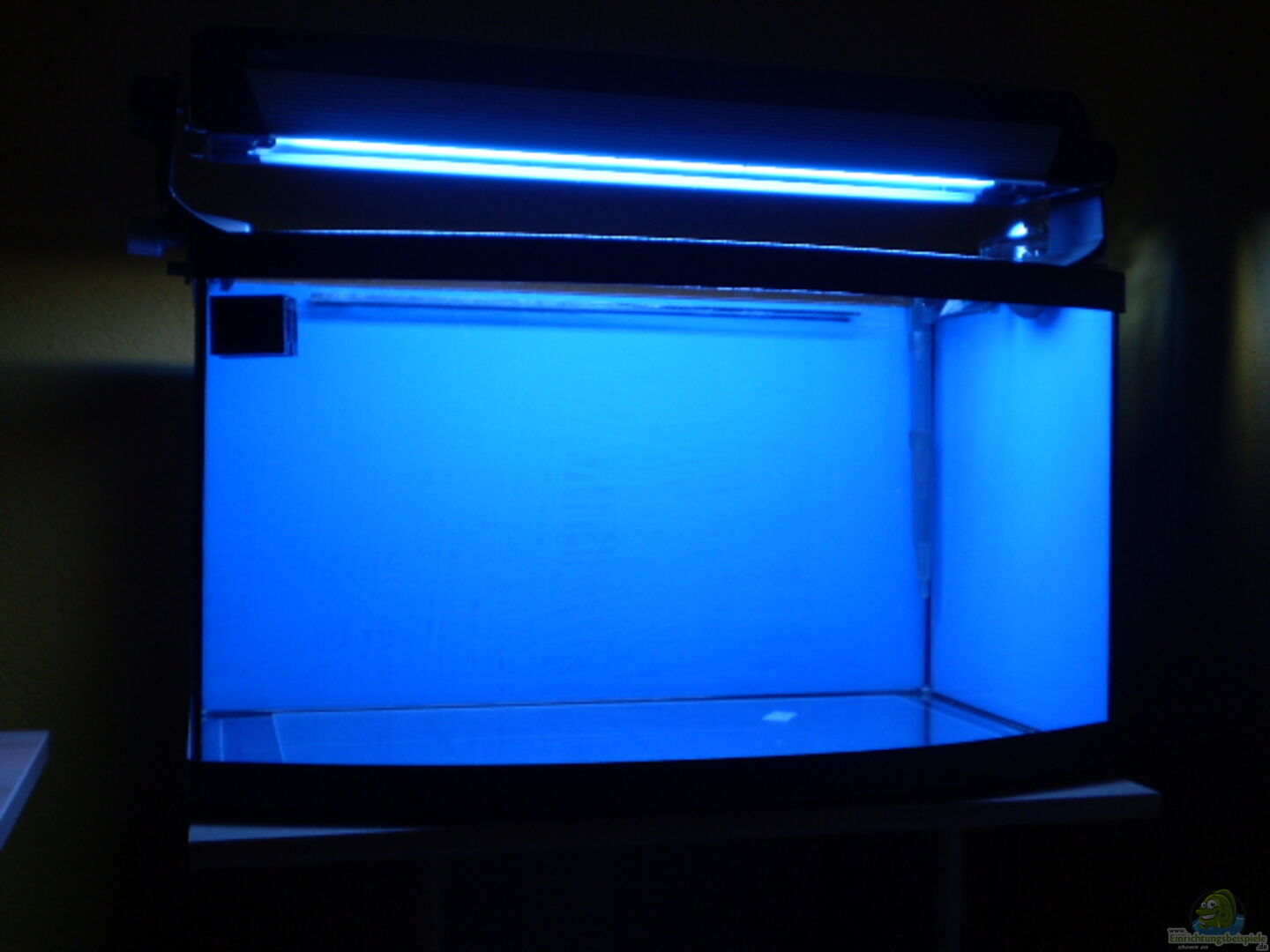 - Becken mit gebogener Frontscheibe, deshalb die unterschiedlichen Breiteangaben. - Die Rückwand und die rechte Seitenscheibe ist mit einer dunkelblauen Folie beklebt worden. - Plexigla??bodenplatte zum Schutz vor Gla??bruch - Plexigla??abdeckscheibe