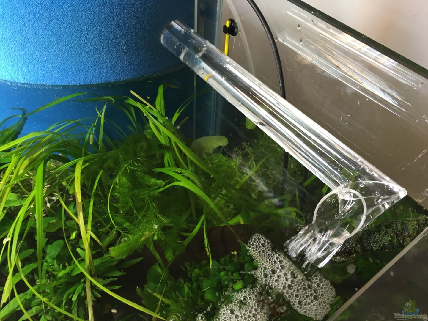 Zur Verwendung kommt eine CO2-Anlage, die aus Komponenten verschiedener Hersteller besteht (Druckminderer, Finimeter und Regelventil). Die CO2-Reaktion erfolgt über einen Ausströmer, der unterhalb des Rückflussrohrs an der rechten Beckenseite angebracht ist. Auf ein Magnetventil verzichte ich bewusst. Mir sind schon mehrere davon durchgebrannt. Das Ergebnis war, dass ununterbrochen CO2 in die Becken geleitet wurde und mir die Fische zweimal fast erstickt wären. Ich zähle auch die Bläschen nicht, [...]