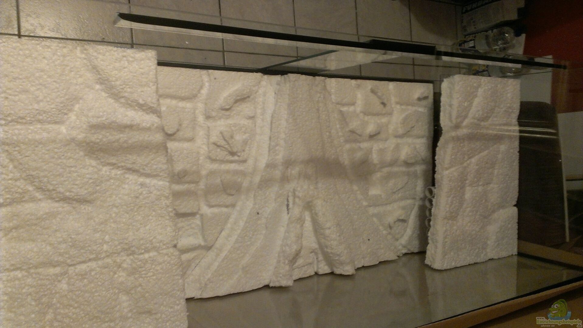 Selbstgebastelte 3D Rückwand aus Styropor und Fliesenkleber. Diese Rückwand hab ich nach dem Wassereinlauf wieder rausreisen müssen, die Farbe löste sich vom Fliesenkleber. Nach gründlicher Ursachenforschung kann es dafür nur eine Erklärung geben: die Restfeuchte des Flie??enklebers. Wenn man bedenkt, das Beton am Tag 1mm trocknet (hat mir ein Fachmann gesagt, bei idealen Bedingungen) hätte ich ja bei schlechten Bedingungen mindestens 14 Tage trocknen lassen müssen. Naja, wie schon einige [...]