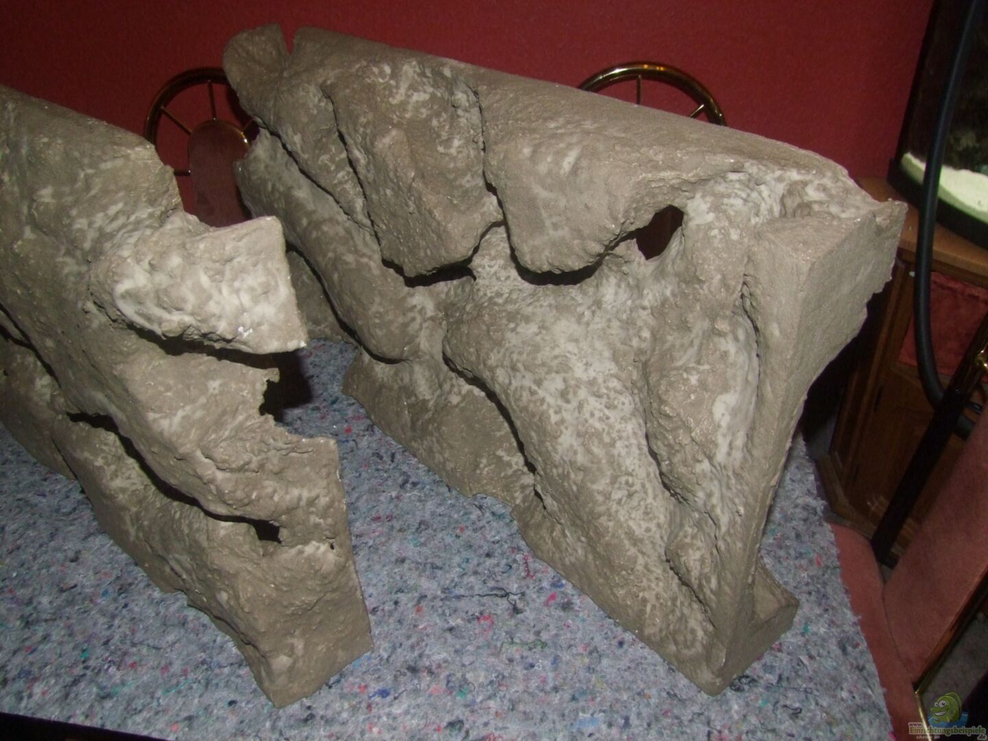 Hinterschwimmbare Rückwand aus Styropor 1, 20x0, 60x0, 14m, Eigenbau mit Höhleneingängen und Felsvorsprüngen. 10mm Styroporplatte zum Schutz der Bodenplatte. Steine für die Felsaufbauten