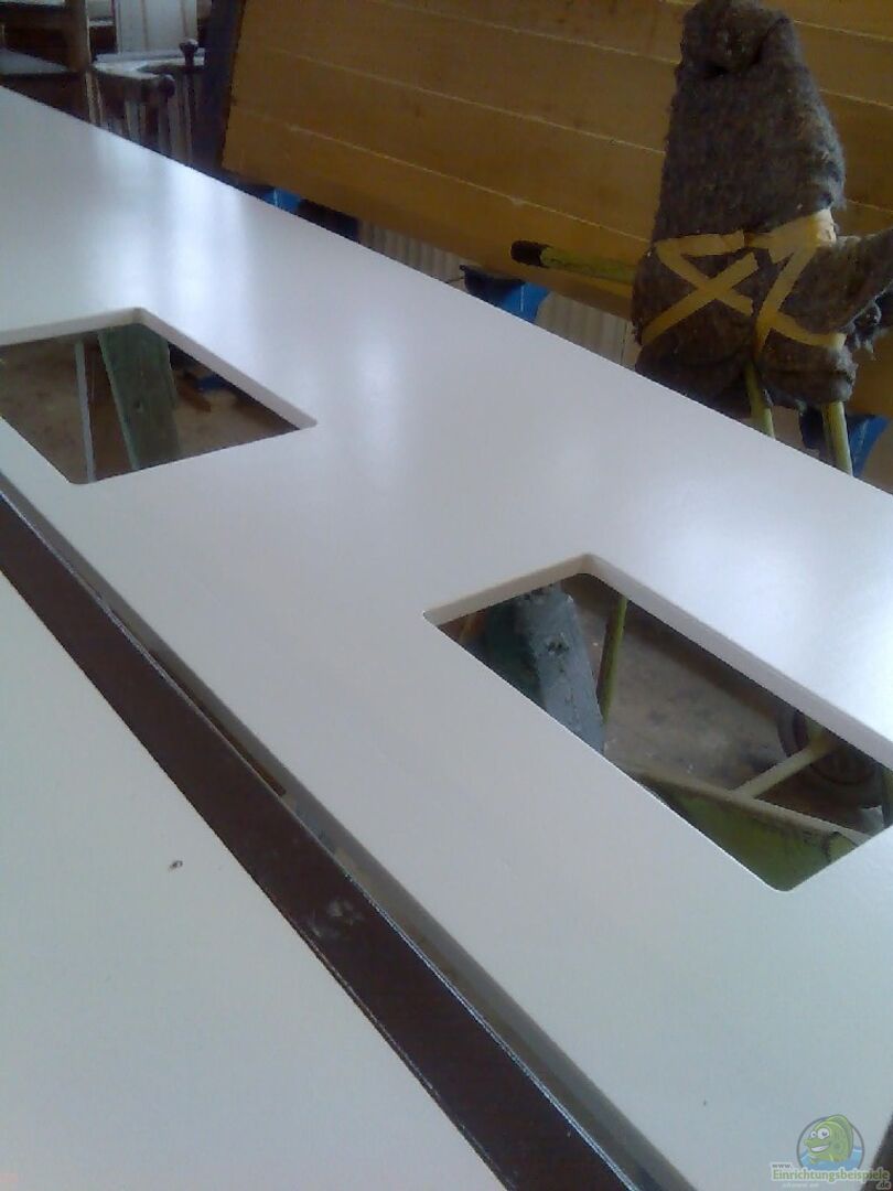 Rückwand, noch liegend, mit Aussparrung für Steckdosen und Mischbatterie von Crenii (4)