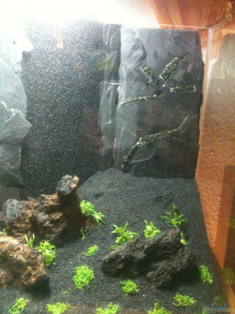 Die Vorrichtung des Hamburgermattenfilter ist mit Schieferstückchen beklebt. Die selbstgebaute Schieferrückwand ist ebenfalls fest eingeklebt. Die Seiten der Rückwand sind nicht komplett geschlossen. So haben die Garnelen die möglichkeit sich dahinter zu verstecken. An dieser Stelle gab es schon interessante Beobachtungen. Mittlerweile sucht hat auch die Wasserpest die Lücken entdeckt und wächst fröhlich dahinter weiter.