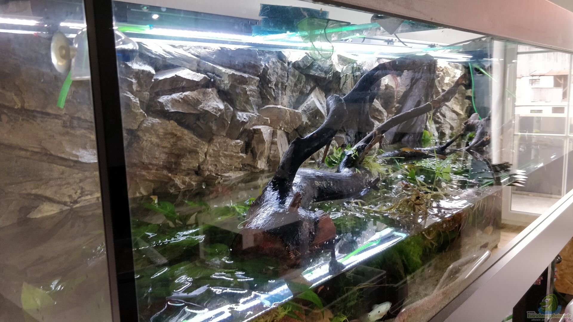 2 x 40 mm Bohrung rechts oben auf der Seite für Ablauf und Notüberlauf, automatischer Wasserwechsel ca 50L täglich, mit Überlauf vom 160L Filterbecken. Unter dem großen Becken ist jetzt ein kleines Aufzuchtbecken. Wird auch über den großen Filter betrieben.