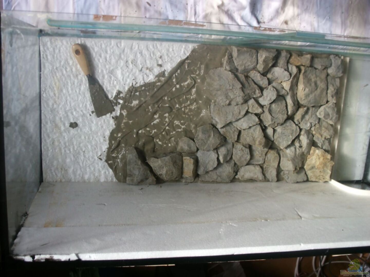 Selbstgebaute Rückwand mit Steinen aus einem nahe gelegenen Steinbruch. Aus den selben Steinen sind auch die Aufbauten (ca. 70 - 80 kg) im Becken um einen einheitlichen Farbton zu bekommen. Das anfertigen der Rückwand war nicht alt zu schwer. Ich hab mich ein bisschen an der Vorlage von Klaus Kussmann (An dieser Stelle nochmal Herzlichen dank für die Erstellung der Bauanleitung) gehalten, nur das ich nicht eine Hartschaumplatte sondern eine Styroporplatte benutz [...]
