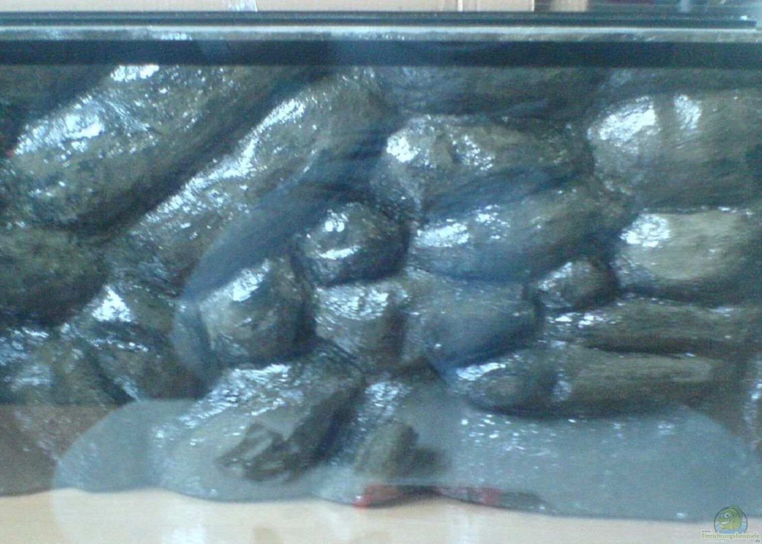 Selbst gebaute Rückwand aus Styropor, beschichtet mit einer Mischung aus Quarzsand und Zement - mit Epoxidharz versiegelt.