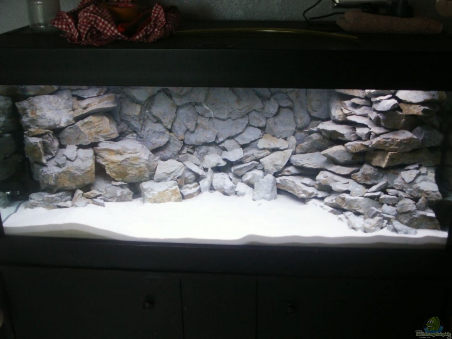 Selbstgebaute Rückwand mit Steinen aus einem nahe gelegenen Steinbruch. Aus den selben Steinen sind auch die Aufbauten (ca. 70 - 80 kg) im Becken um einen einheitlichen Farbton zu bekommen. Das anfertigen der Rückwand war nicht alt zu schwer. Ich hab mich ein bisschen an der Vorlage von Klaus Kussmann (An dieser Stelle nochmal Herzlichen dank für die Erstellung der Bauanleitung) gehalten, nur das ich nicht eine Hartschaumplatte sondern eine Styroporplatte benutz [...]