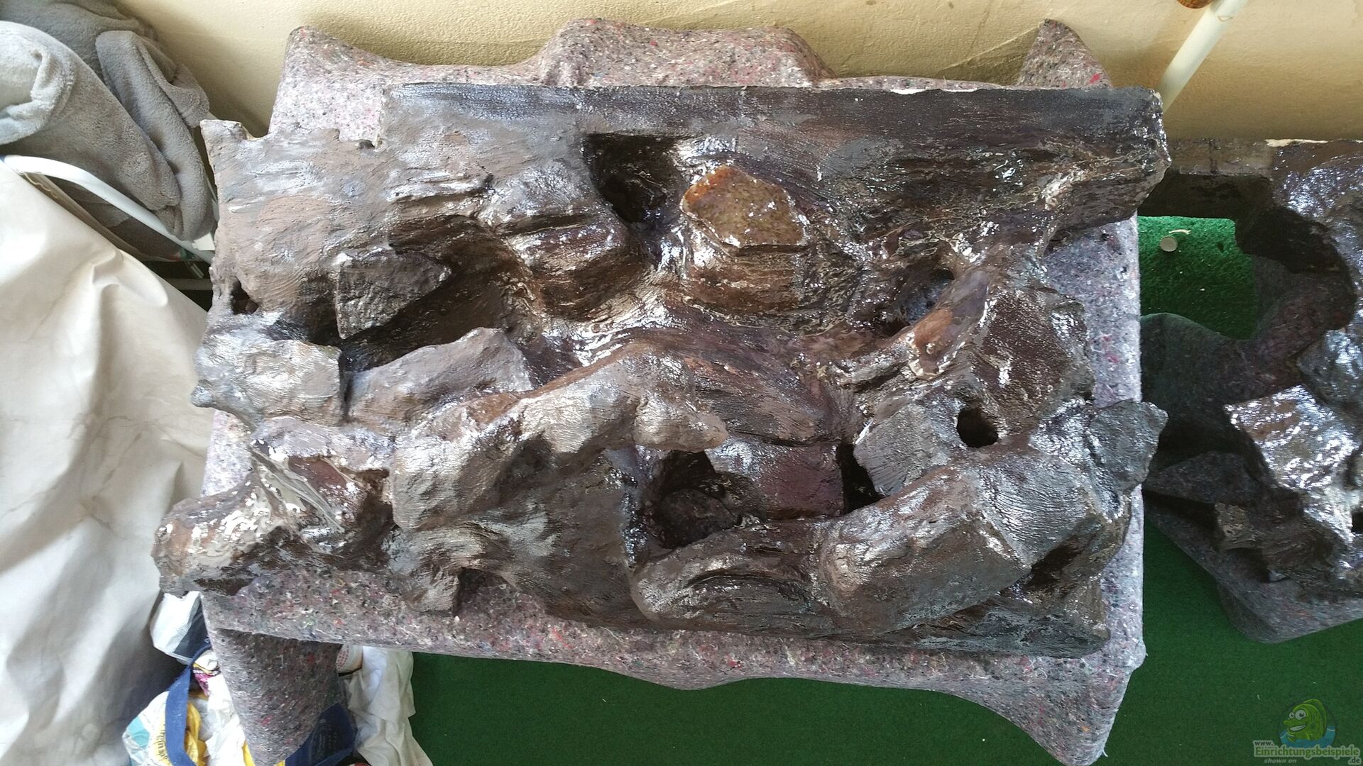 Hinterschwimmbare Rückwand aus Styropor 1, 20x0, 60x0, 14m, Eigenbau mit Höhleneingängen und Felsvorsprüngen. 10mm Styroporplatte zum Schutz der Bodenplatte. Steine für die Felsaufbauten
