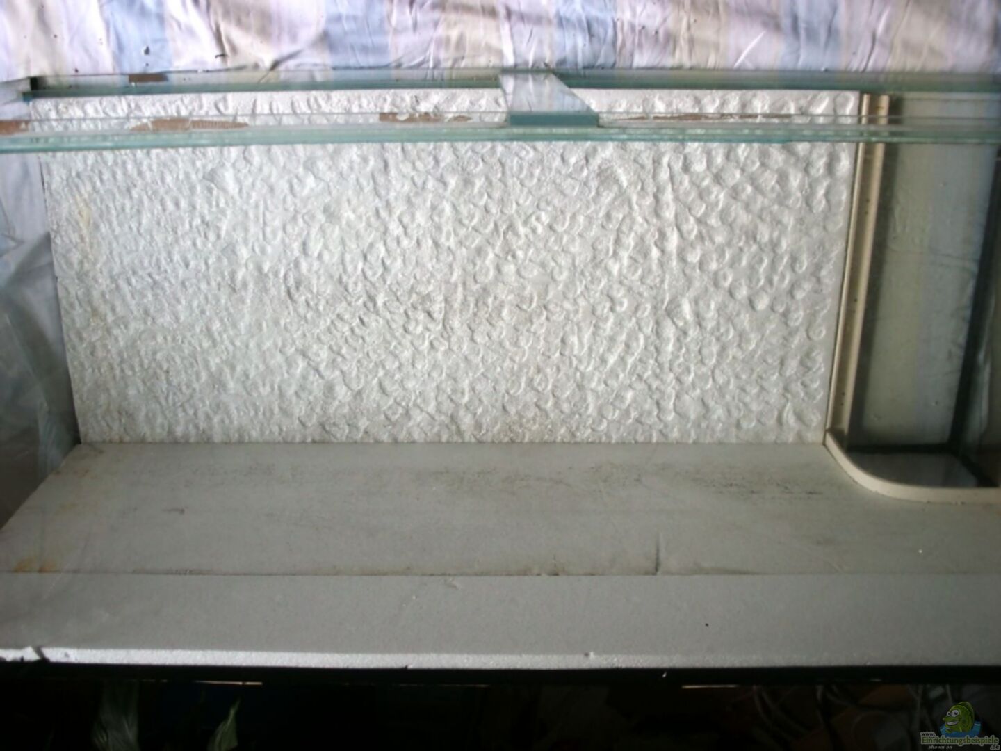 Selbstgebaute Rückwand mit Steinen aus einem nahe gelegenen Steinbruch. Aus den selben Steinen sind auch die Aufbauten (ca. 70 - 80 kg) im Becken um einen einheitlichen Farbton zu bekommen. Das anfertigen der Rückwand war nicht alt zu schwer. Ich hab mich ein bisschen an der Vorlage von Klaus Kussmann (An dieser Stelle nochmal Herzlichen dank für die Erstellung der Bauanleitung) gehalten, nur das ich nicht eine Hartschaumplatte sondern eine Styroporplatte benutz [...]