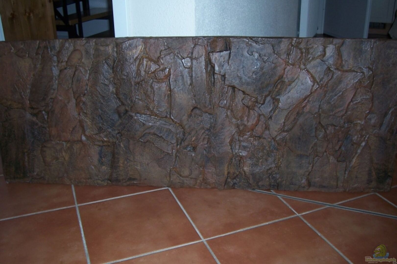 ca. 60 kg dunkler Basaltbruch Die ganze Einrichtung steht auf einer 2 mm Plexiglasscheibe 3 D Rückwand Felsen 150/60 Felsvorsprünge ca. 1-4 cm , sieht auf den Fotos sehr braun aus , ist im Orginal aber nicht wirklich so braun ......
