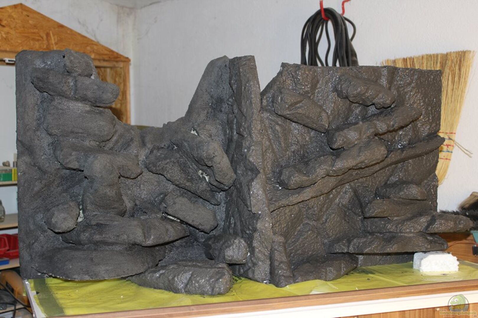 Rückwand selbst gebaut aus Styropor und Fliesenkleber gemischt mit abtönfarbe und versiegelt mit Epoxidharz. 30 kg Nero ebano bruchsteine