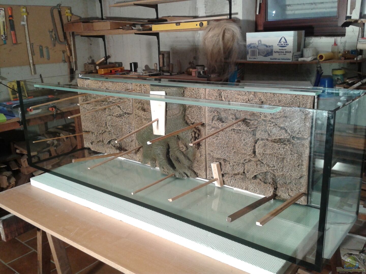 - Glasstärke 10 mm Floatglas mit schwarzem Silikon sto??verklebt - 1 Längssteg (Rückwand), der 2. (Frontseite) wurde nachträglich von mir zum besseren ???Händling??? bzw. Reinigung des Beckens entfernt. - ma??angefertigte Aquarienabdeckung passend in nussbaumfarben mit einer klassischen Baumarkt-Feuchtraumleuchte mit 2x36 Watt - Rückwandmodule von Juwel (Modell Root und Rock) - 5cm hohe aufgeklebte Sichtschutzblende für den Bodenbereich - bestehende Wohnraumkommode [...]