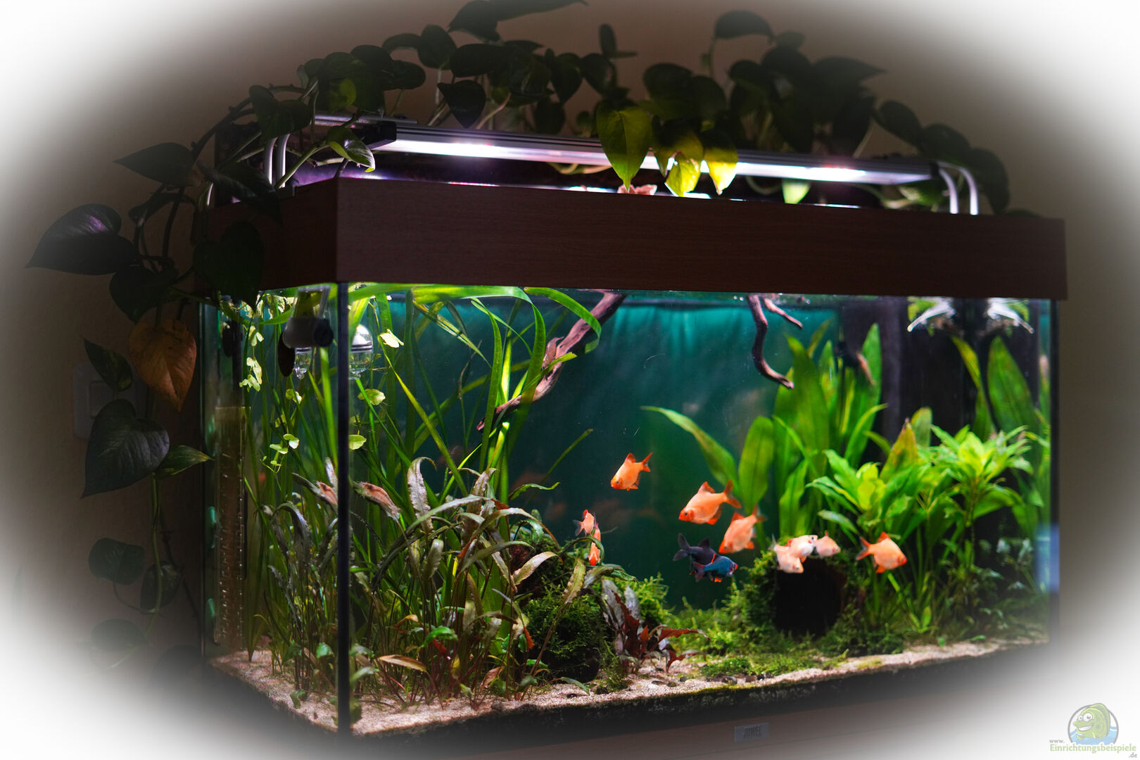 Es handelt sich um ein Juwel Rio 125 Standardbecken, welches offen mit nachgerüstetem LED-Licht und ma??angefertigter Glaspflanzrinne betrieben wird, dessen Pflanzen durch eine zusätzliche Pumpe mit Aquarienwasser versorgt werden. Es handelt sich um ein reines asiatisches Artenbecken.