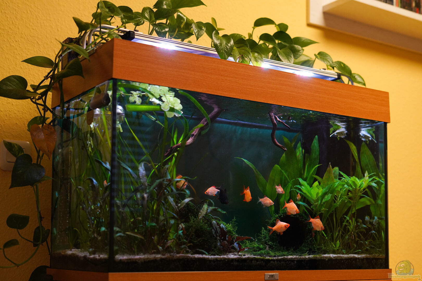 Es handelt sich um ein Juwel Rio 125 Standardbecken, welches offen mit nachgerüstetem LED-Licht und ma??angefertigter Glaspflanzrinne betrieben wird, dessen Pflanzen durch eine zusätzliche Pumpe mit Aquarienwasser versorgt werden. Es handelt sich um ein reines asiatisches Artenbecken.